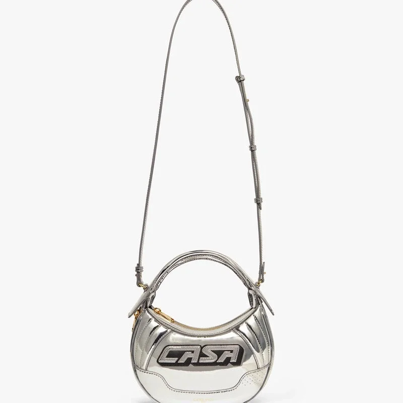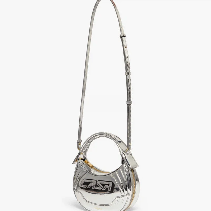 A Mochila de Motociclista Prateada é confeccionada em couro, apresentando a inscrição «Casa» da marca na frente. Completa-se com uma alça, fecho de correr, detalhes em fecho de correr, ferragens banhadas a ouro e uma silhueta arredondada. Fornecida com uma caixa de presente, um saco de proteção com a marca e um manual com detalhes do produto.