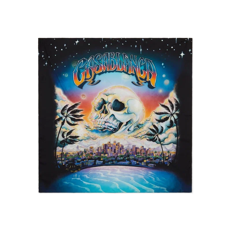 O lenço de seda grande La Pramonition apresenta um desenho estampado em tecido de sarja de seda, com a obra de arte sazonal da marca: uma visão misteriosa da linha do horizonte de La à noite, com elementos de OVNIs que remetem a uma inspiração vintage de ficção científica. Rematado com uma borda preta.