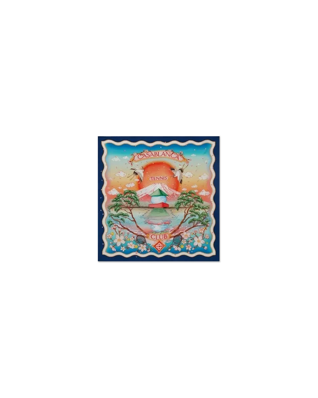 O lenço de seda médio Tennis Club é um design estampado confeccionado em tecido de sarja de seda, apresentando a arte emblemática da marca, utilizando o nosso layout clássico, mas com arte tradicional japonesa, tornando-o uma peça com uma narrativa muito forte. Rematado com uma borda ondulada às riscas azuis e brancas.