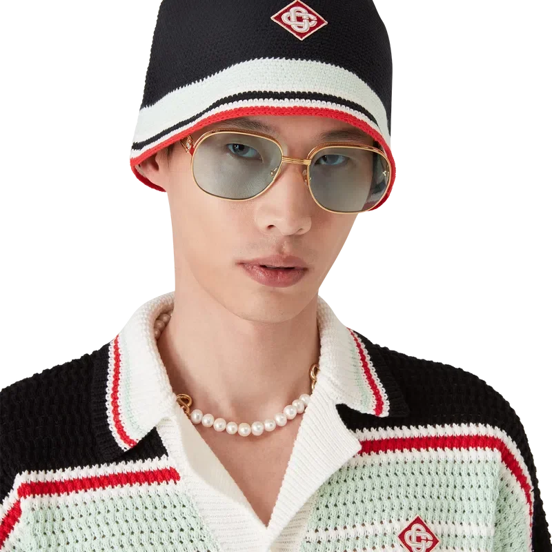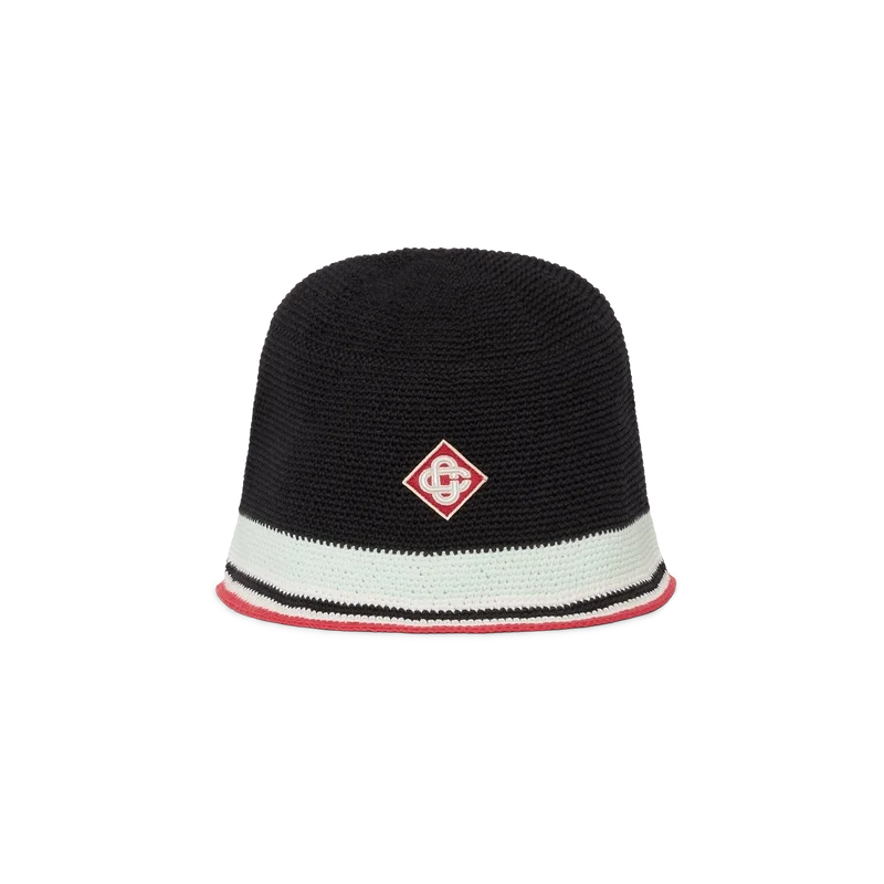 O chapéu de croché às riscas tem um design tipo balde, confecionado num tecido de algodão de croché de textura suave e malha aberta — o acessório de verão por excelência. Apresenta uma aba às riscas em azul, vermelho, menta e branco, e um aplique com o Diamond Monogram no centro.
