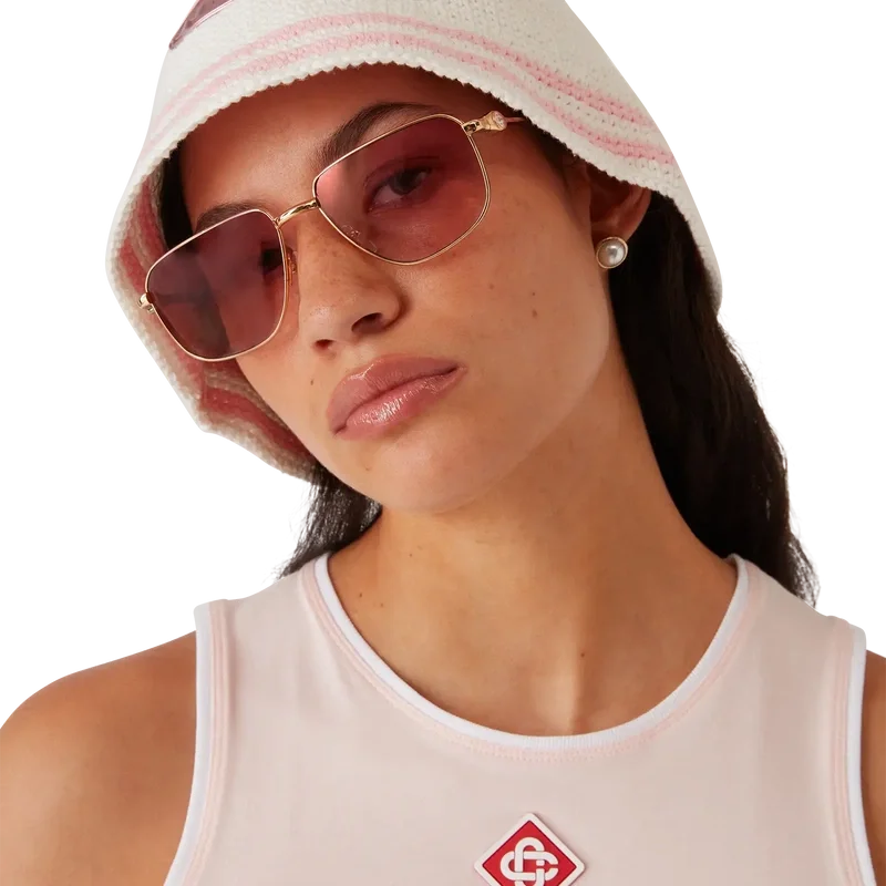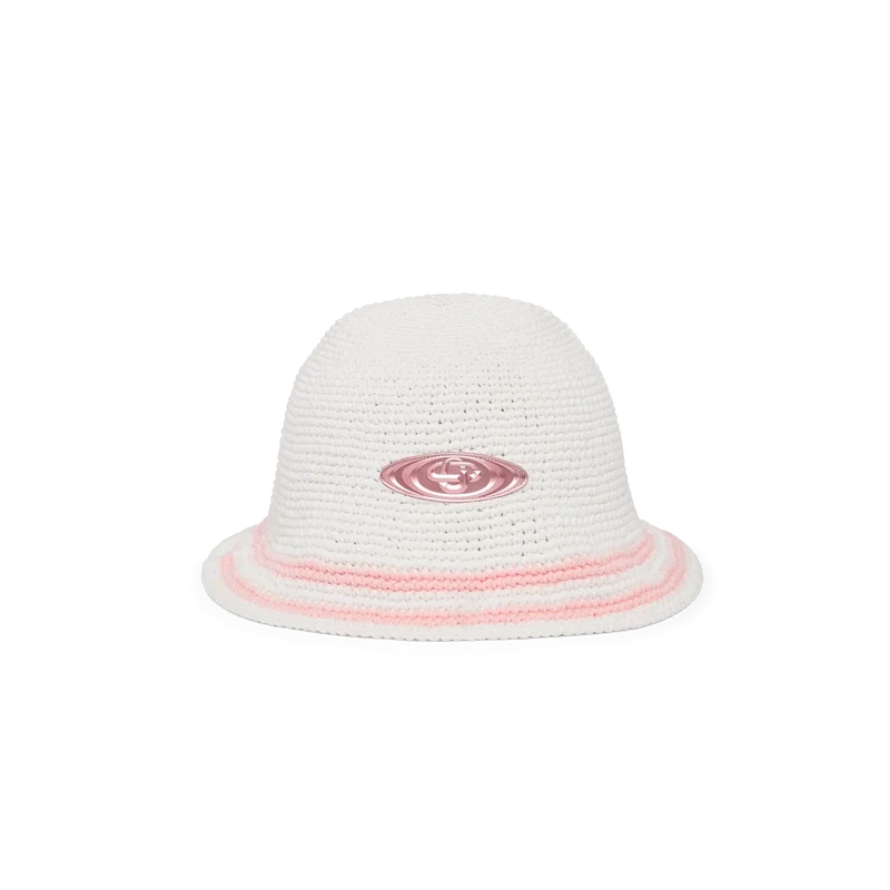 O chapéu de croché Bourgeoisie Girl apresenta uma silhueta clássica tipo balde, com um emblema do logótipo Casablanca Warped que acrescenta dimensão textural ao design inspirado no vestuário desportivo. Completado com uma aba às riscas rosa e branca.