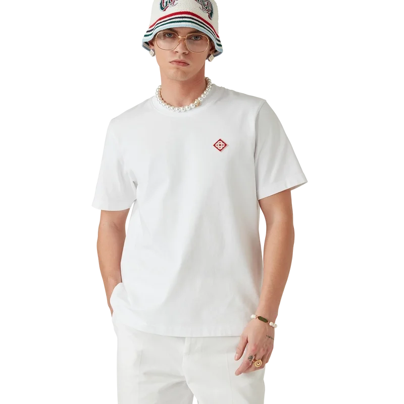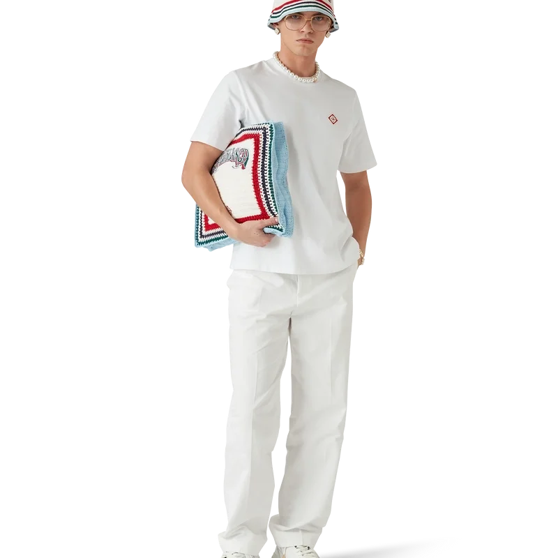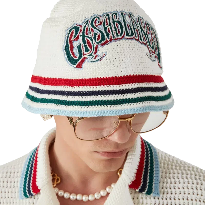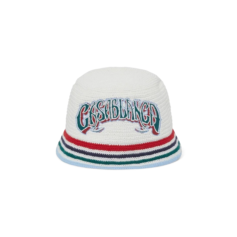 O chapéu de croché gótico é um modelo tipo balde, confecionado em tecido de algodão de croché de malha aberta e textura suave — o acessório de verão por excelência. Apresenta uma aba às riscas vermelha, azul-marinho, verde, azul e branca, e um aplique com a tipografia do logótipo Casablanca desenhada à mão, inspirada no tipo de letra gótico utilizado em tatuagens, no seu centro.