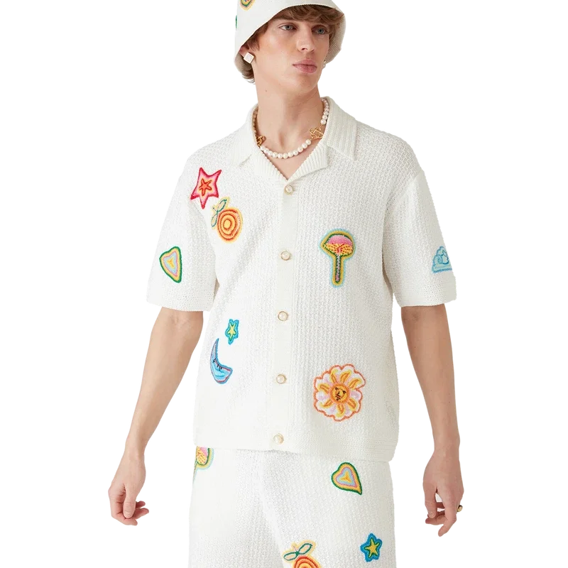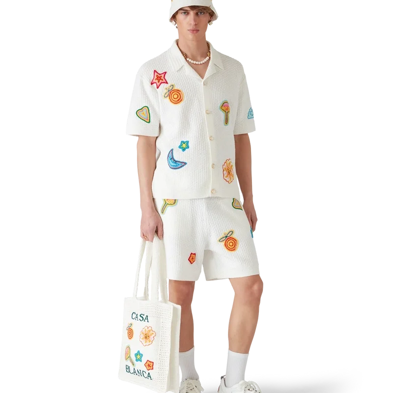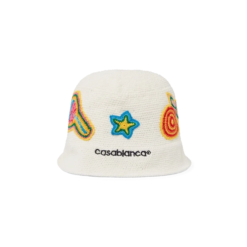 O chapéu de croché Motif é um modelo tipo balde, confeccionado em tecido de algodão de croché de malha aberta e textura suave — o acessório de verão por excelência. Apresenta uma aba, o logótipo Casablanca bordado e apliques com os elementos de design clássicos da marca no centro.
