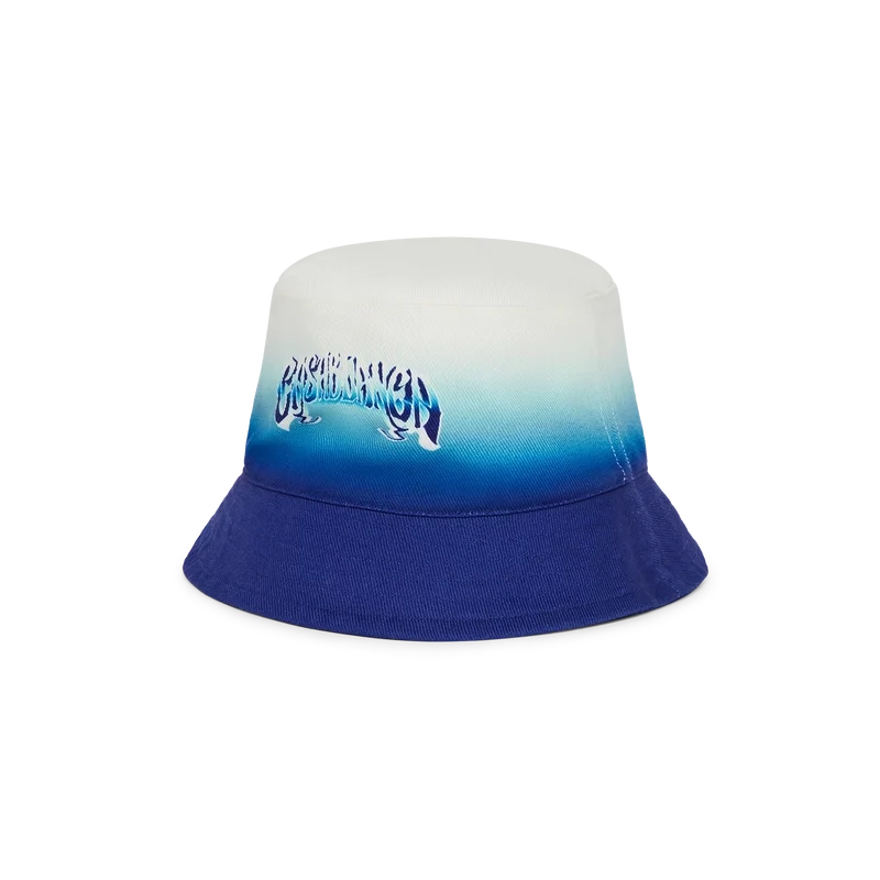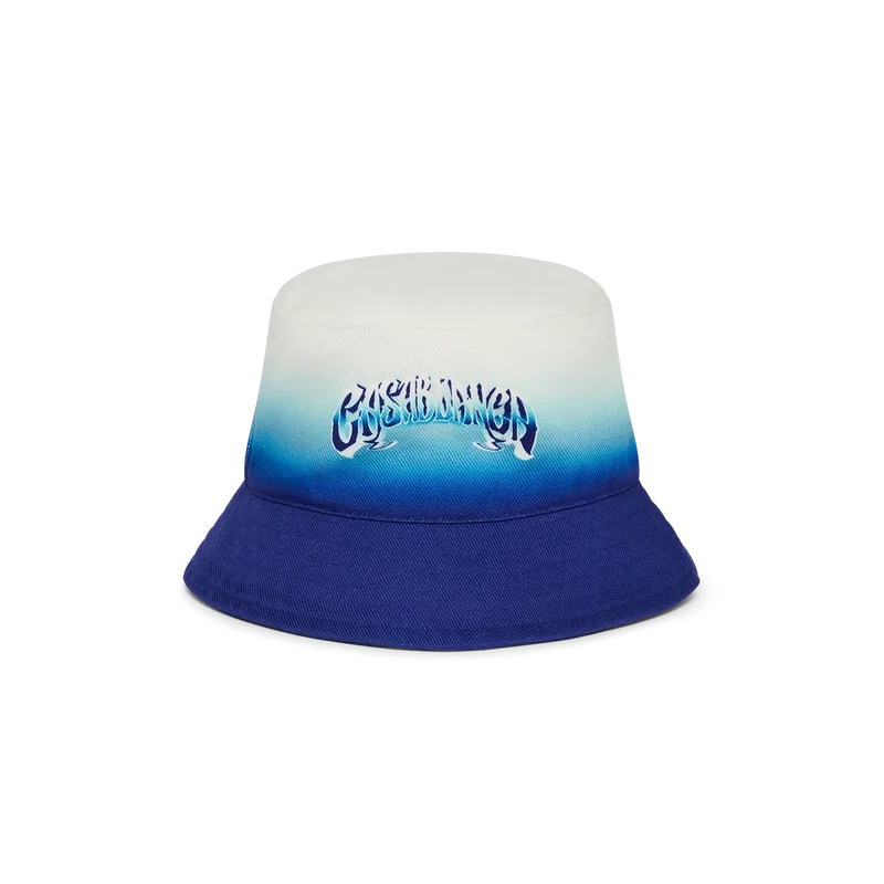 O chapéu de pescador Blue Fade é confeccionado em tecido de algodão com tipografia desenhada à mão do logótipo Casablanca, inspirada no tipo de letra gótico utilizado em tatuagens. Rematado com uma aba em azul esbatido com degradê.