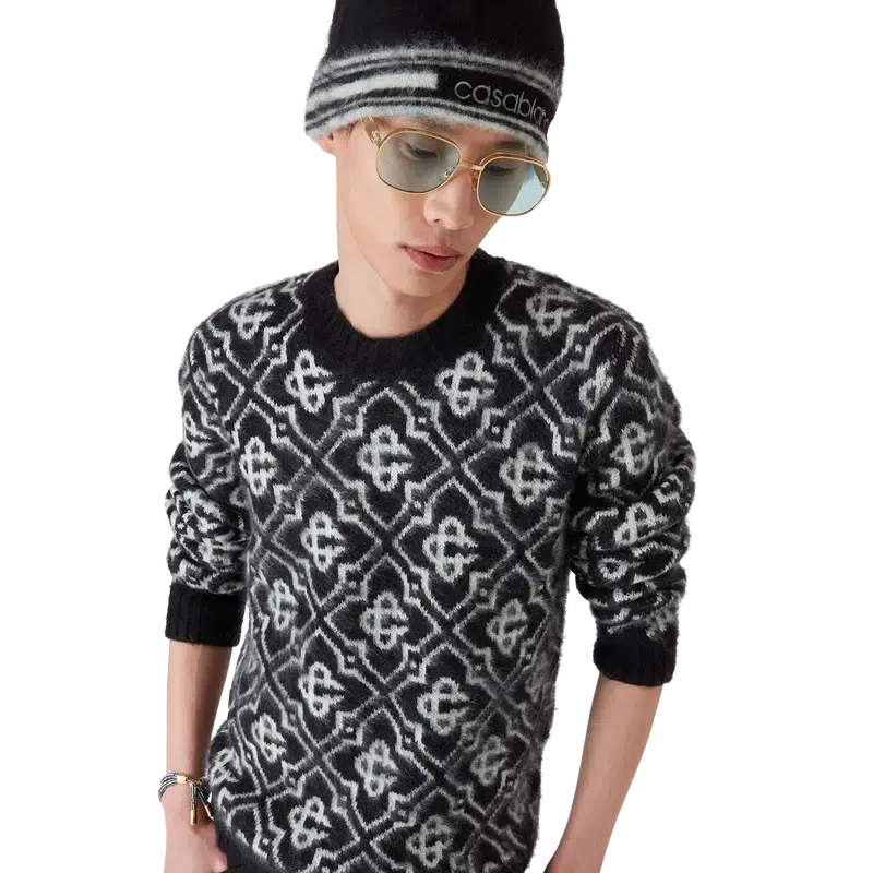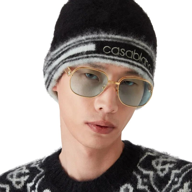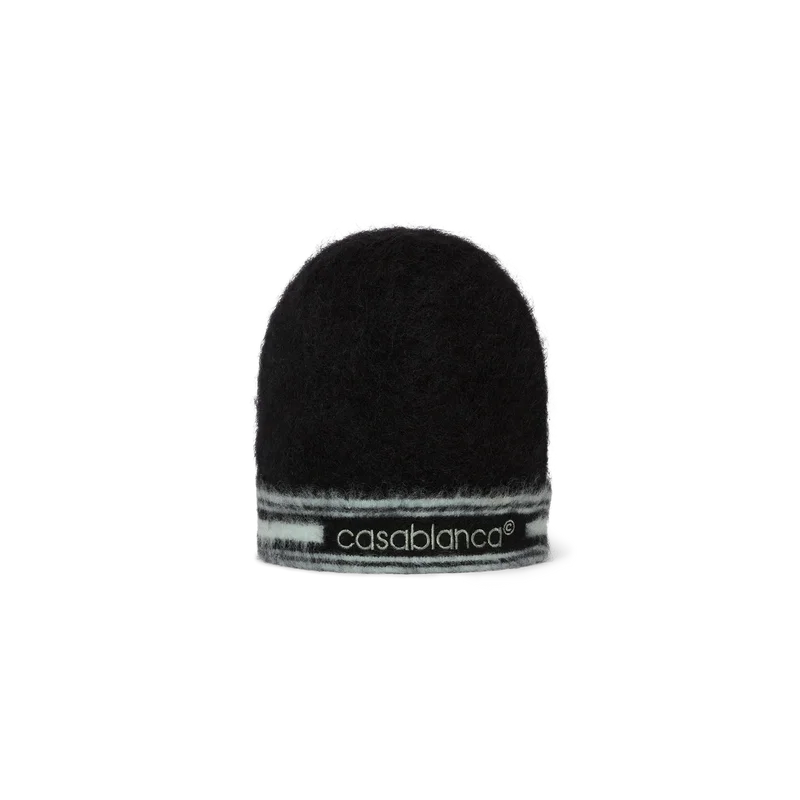 O gorro de mohair às riscas é um modelo tricotado, confecionado em tecido de mohair. Apresenta o logótipo Casablanca e detalhes às riscas à volta da aba.
