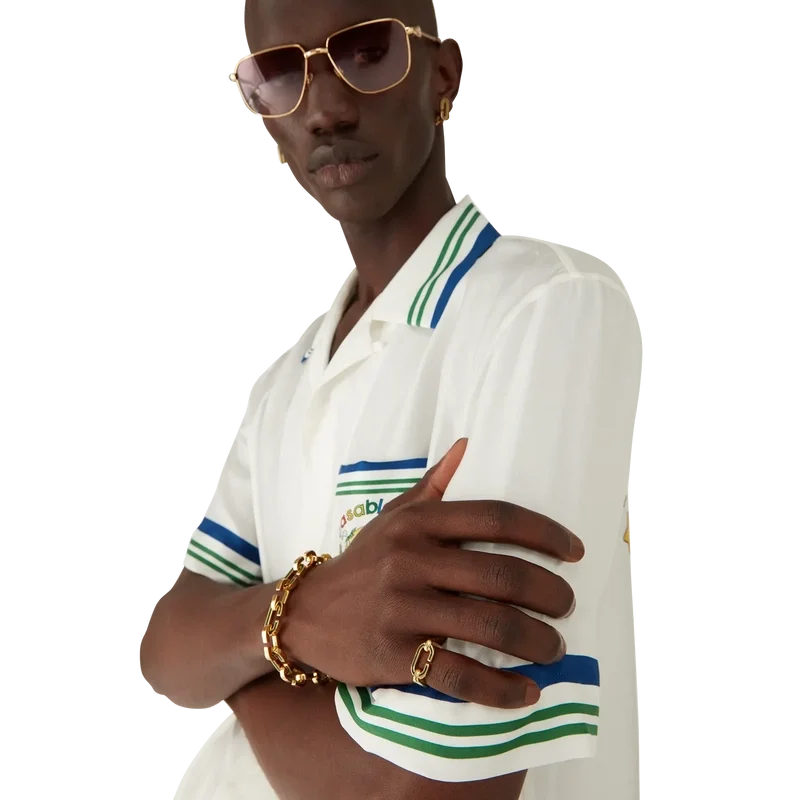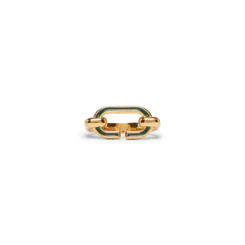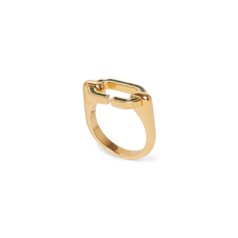 O Anel C Link é um design minimalista confecionado em latão banhado a ouro e esmalte. Concluído com um «C» em esmalte verde pintado à mão e uma banda banhada a ouro.