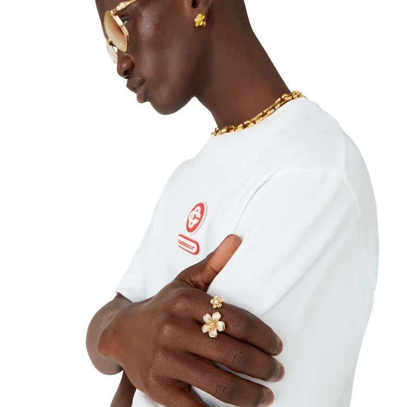 O Anel Flor foi concebido com o estilo de duas flores de tamanhos diferentes e é fabricado em latão banhado a ouro e esmalte. Este artigo é fornecido com uma bolsa de proteção Casablanca, uma caixa e um manual do produto.