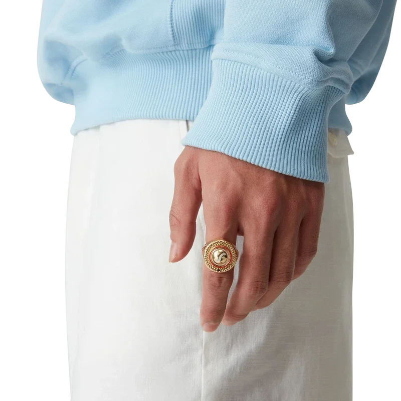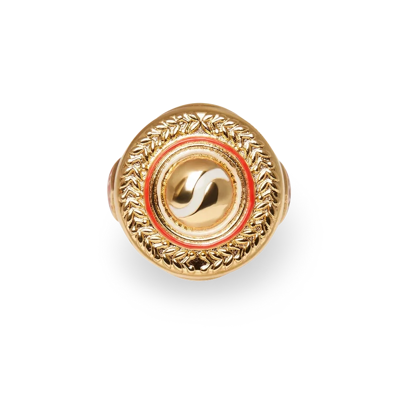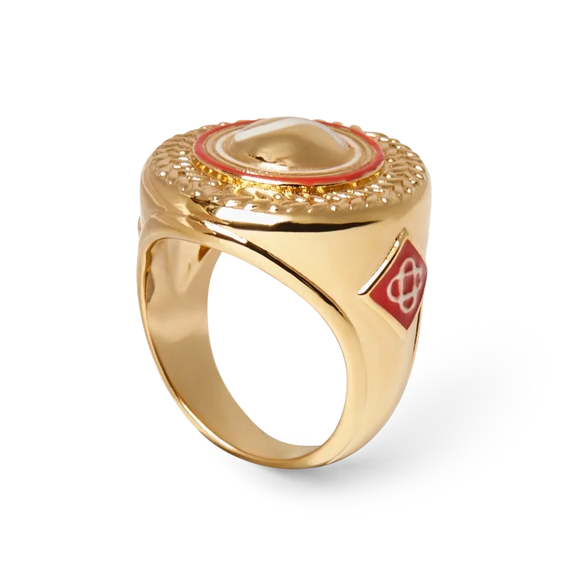 O Anel Medallion Desportivo é fabricado em latão banhado a ouro e esmalte pintado à mão. Apresenta o logótipo de diamante emblemático da marca nas hastes.