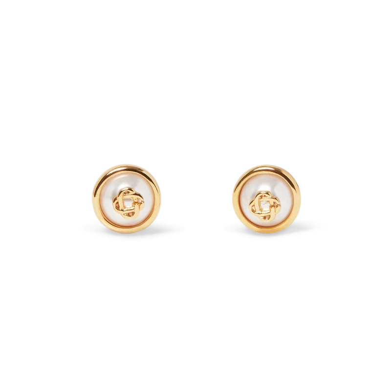 Os brincos com logótipo de pérola são um par de brincos em forma de cúpula, confecionados em pérola de vidro e latão banhado a ouro. Completados com o logótipo CC entrelaçado da marca, colocado no topo da cúpula.