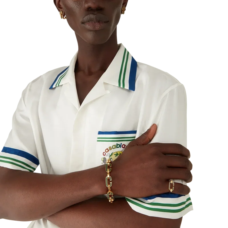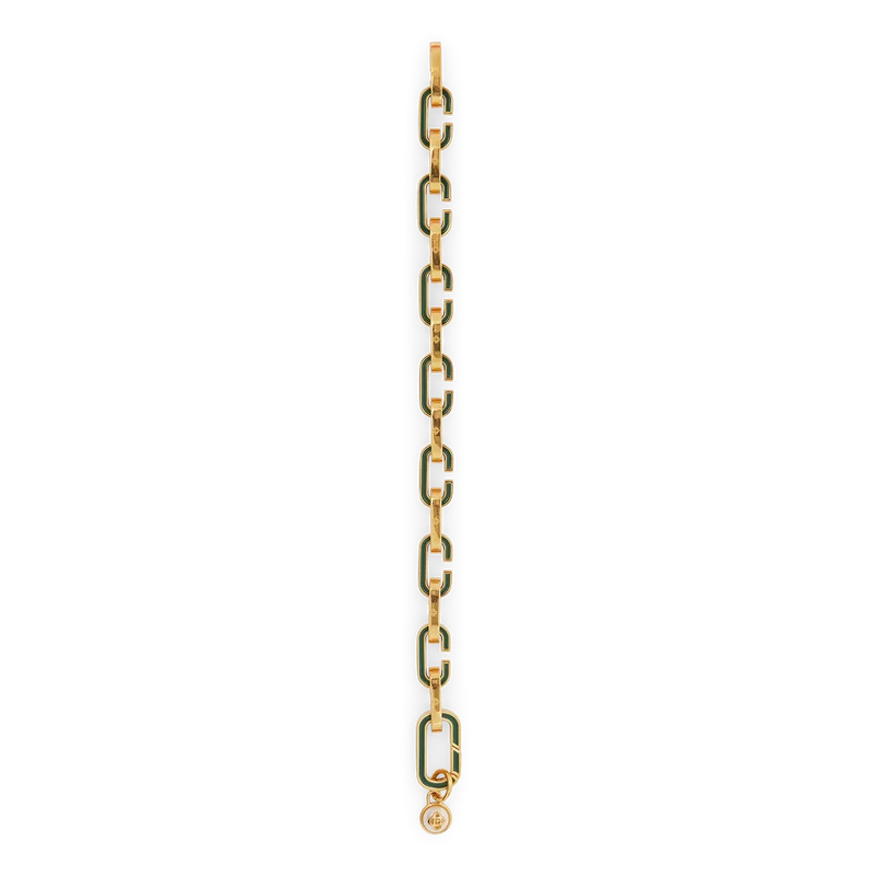 A pulseira com elos em forma de «C» é fabricada em latão banhado a ouro e esmalte. Apresenta uma corrente banhada a ouro com elos em forma de «C» pintados à mão com esmalte verde.