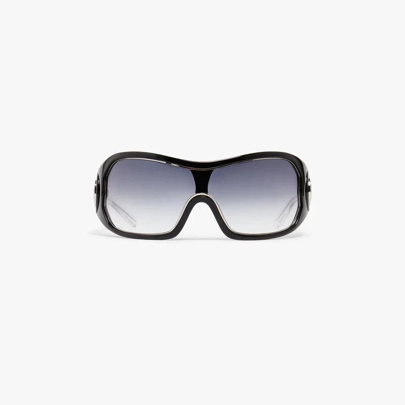 Os óculos de sol Black Outline Shield são fabricados em acetato e metal com uma armação envolvente, apresentando uma silhueta arquitetónica elegante. As lentes cinzentas degradadas oferecem 100% de proteção UV e o modelo é completado com o logótipo CC entrelaçado em tom prateado da marca nas hastes, para um toque final requintado.