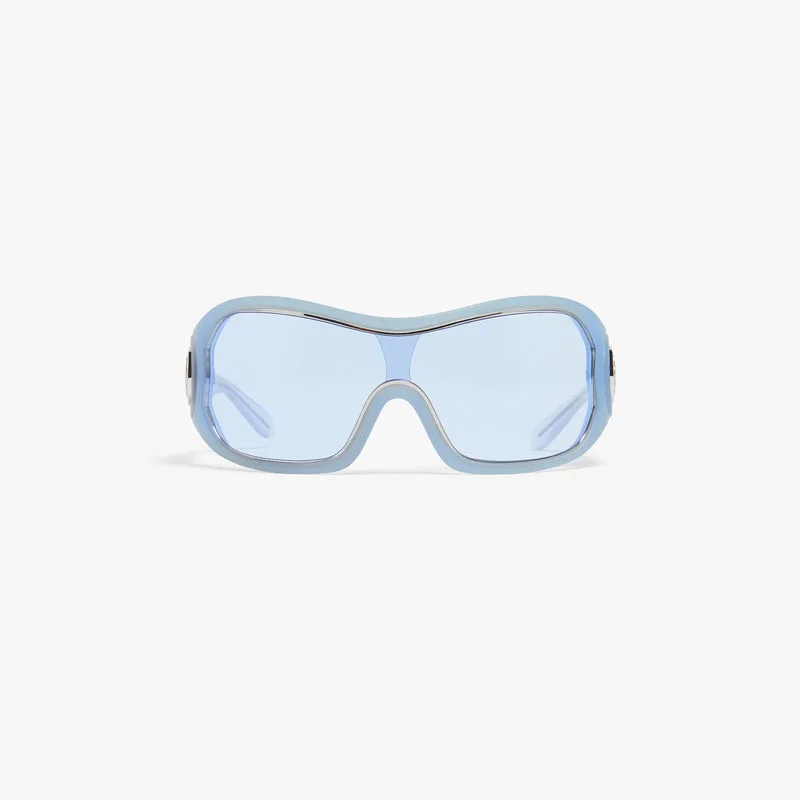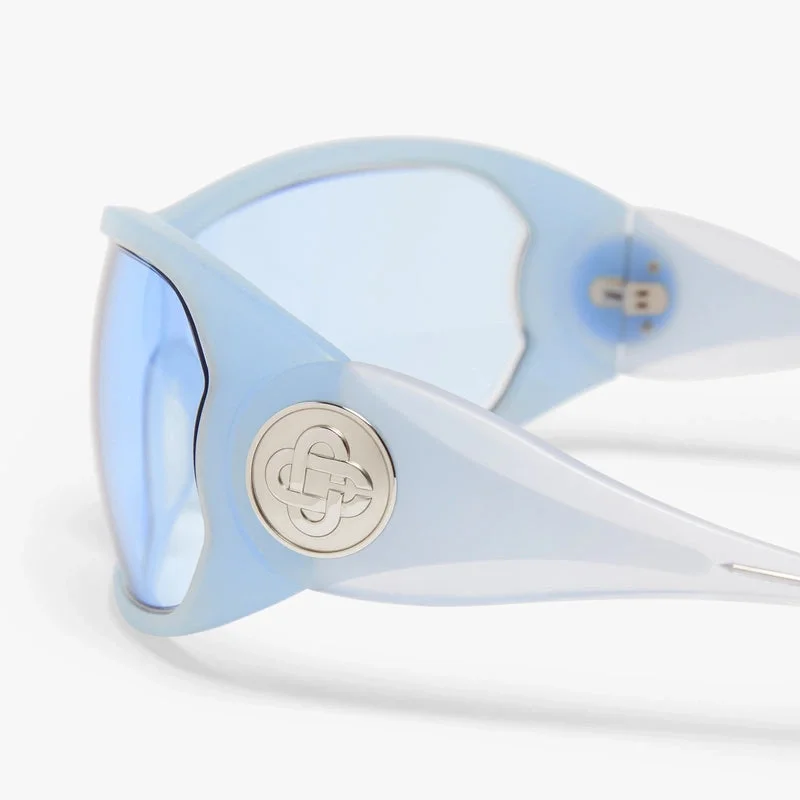 Os óculos de sol Blue Outline Shield são fabricados em acetato e metal com uma armação envolvente, apresentando uma silhueta arquitetónica elegante. As lentes com gradiente azul oferecem 100% de proteção UV e o estilo é completado com o logótipo CC entrelaçado em tom prateado da marca nas hastes, para um toque final refinado.