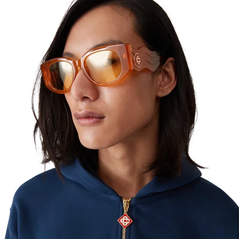 A estrutura em acetato laranja vivo dos óculos de sol Memphis define estes óculos de sol de armação retangular. Aqui, o logótipo Diamond Monogram, característico da marca, está posicionado nas hastes. As lentes degradadas oferecem 100% de proteção UV e o modelo é acompanhado por uma caixa Casablanca, um pano de limpeza e um folheto de garantia.