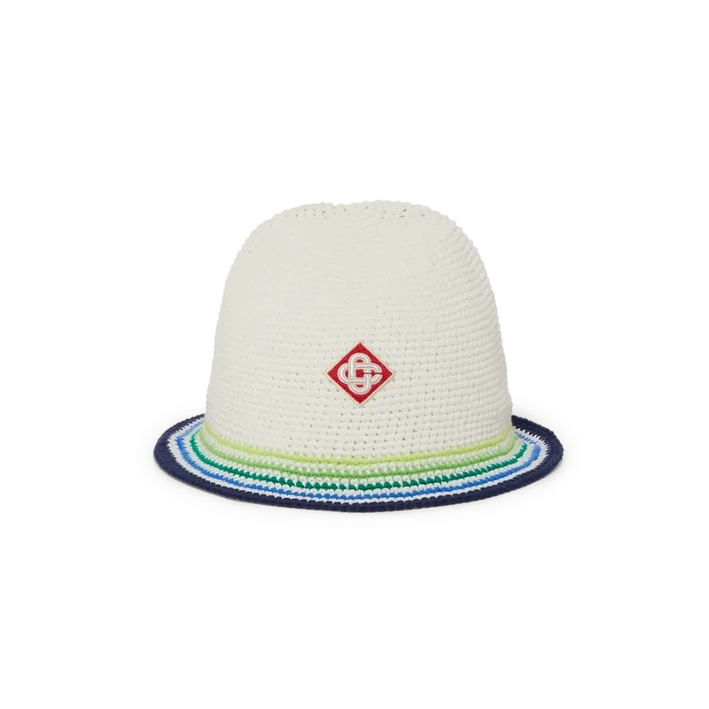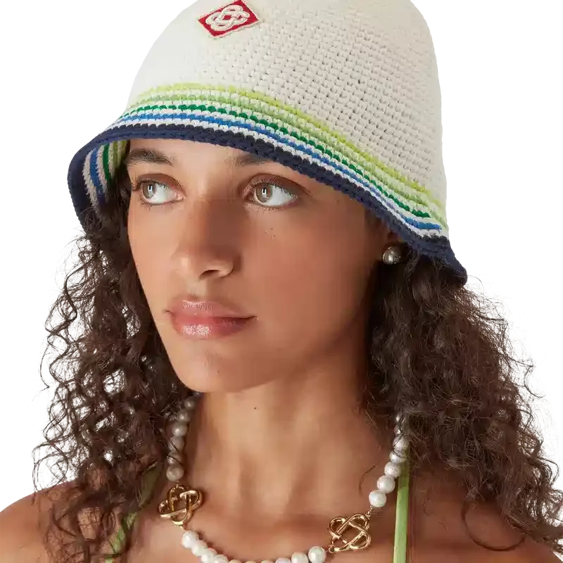O boné Beach Club é um modelo refinado em estilo balde, confeccionado em algodão de croché, com o logótipo de diamante emblemático da marca no centro. Rematado com uma aba às riscas em azul, verde, amarelo e branco.