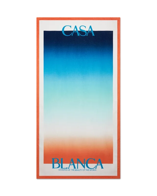 A toalha de praia Gradient é um design estampado confecionado em tecido de algodão felpudo com o gradiente da estação. Apresenta o logótipo empilhado da marca e uma borda azul-marinho.