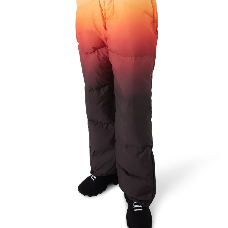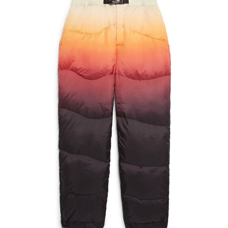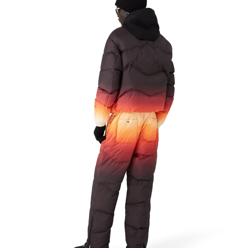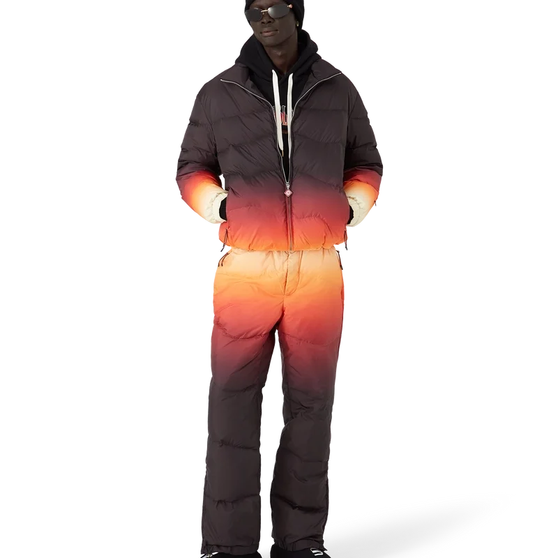 As calças de esqui apresentam um design requintado da Apras-Sport, confeccionadas em tecido de penas com estampado em degradê, com um degradê multicolorido inspirado no espetacular brilho alpino que ilumina a paisagem montanhosa do Japão. Evocando a transição mágica quando tons de rosa e roxo se espalham pelos picos cobertos de neve e os vales rurais brilham com a última luz do dia. Completadas com fecho elástico na frente, bolsos laterais com fecho de correr e bolsos traseiros adornados com ferragens banhadas a prata, e fecho de correr nos tornozelos.