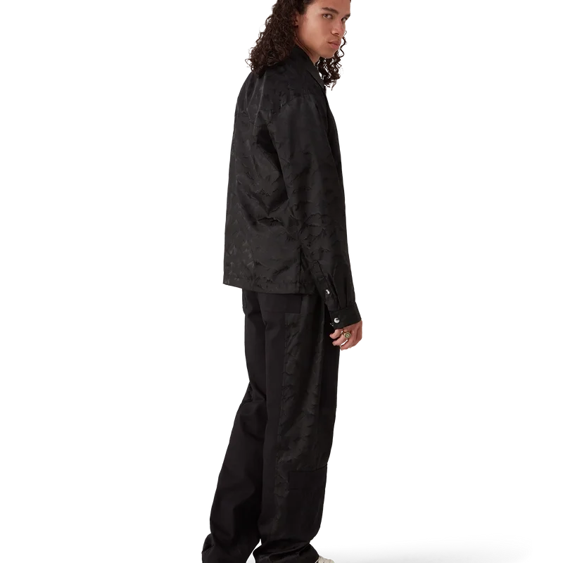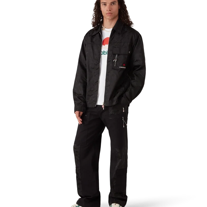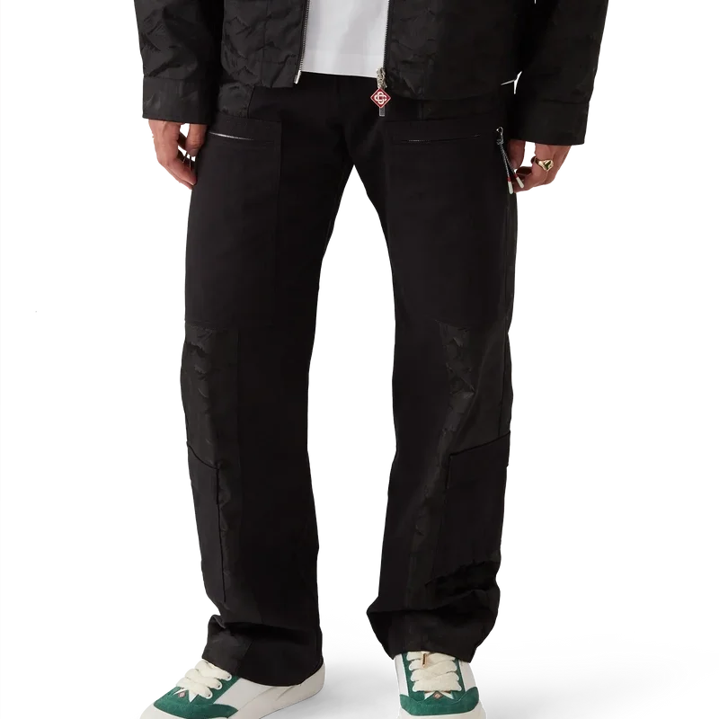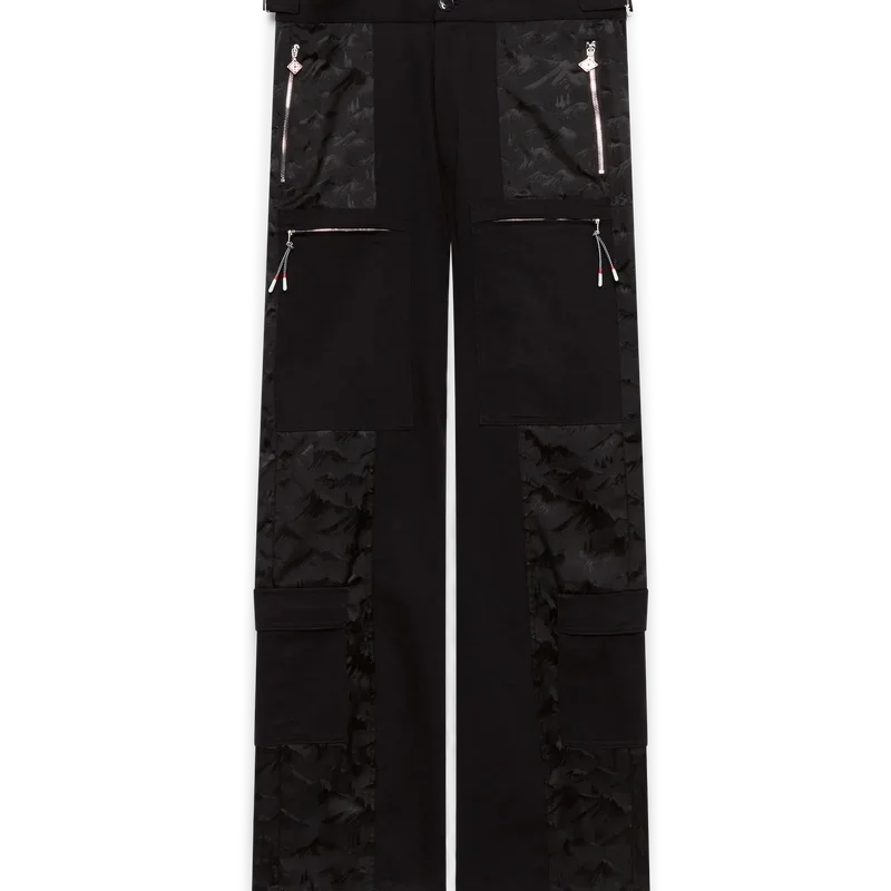 As calças cargo de nylon com padrão camuflado de montanha apresentam um corte reto e são confeccionadas em tecido jacquard de nylon e algodão. Completadas com bolsos nas costuras laterais com fecho de correr, apresentando as abas de fecho com o logótipo de diamante característico da marca, forro, bolsos de remendo na parte superior das coxas com fecho de correr e abas inspiradas em cordas de alpinismo, bolsos com aba na parte inferior das pernas, bolsos de remendo nas costas, fecho de correr e ajustadores laterais.