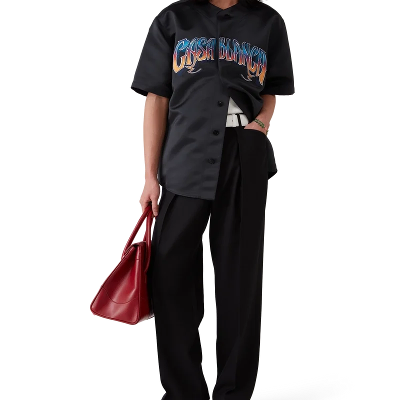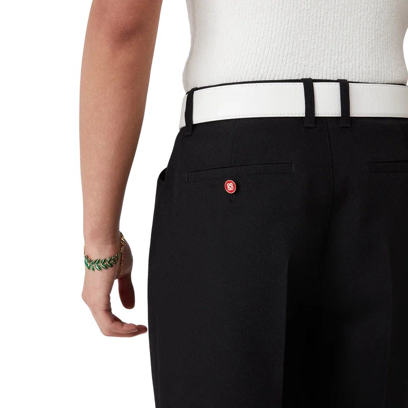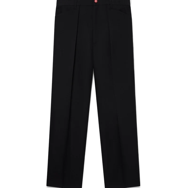 As calças chino plissadas apresentam um corte reto, são confeccionadas em tecido de lã e possuem um forro em mistura de algodão. Completam-se com bolsos frontais inclinados, presilhas para cinto, fecho de correr e bolsos traseiros de debrum.