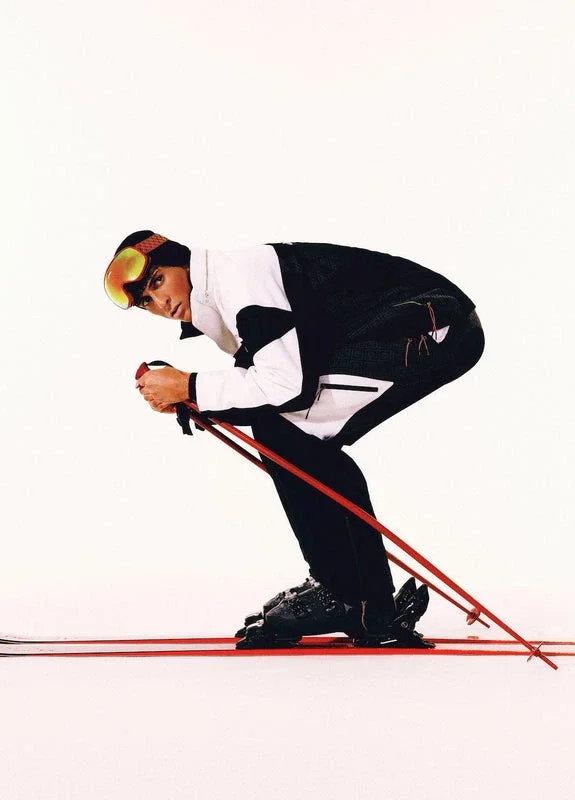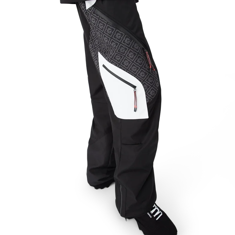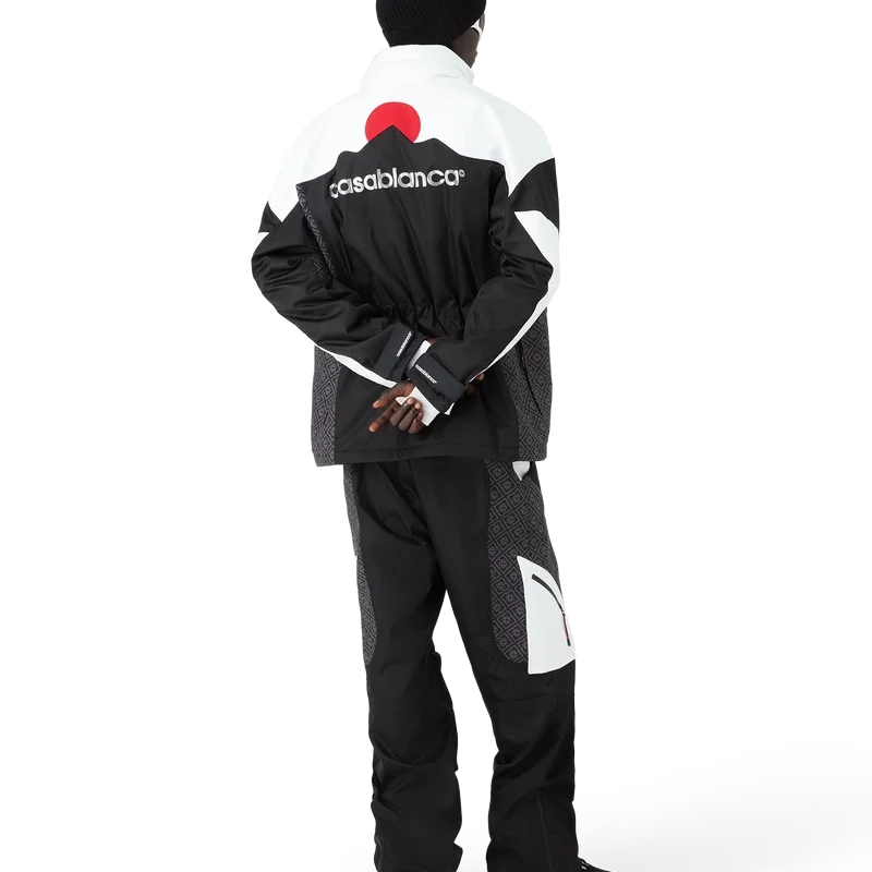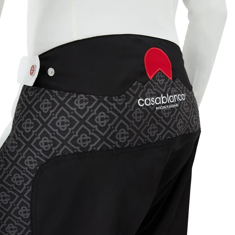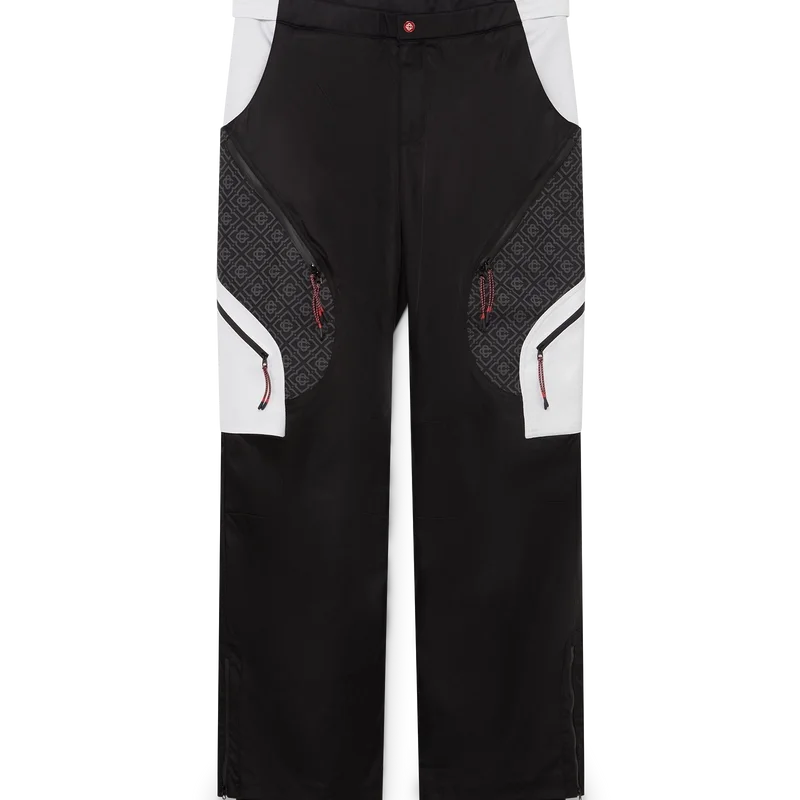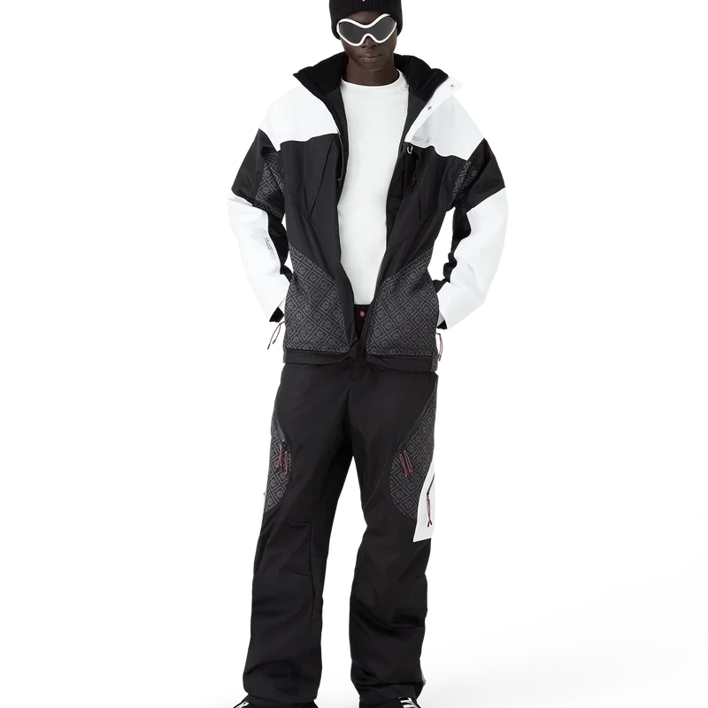 As calças de esqui apresentam um design refinado da Apras-Sport, confeccionadas em tecido ripstop a preto e branco com monograma contrastante, inspiradas na beleza gráfica da paisagem rural japonesa no inverno, onde os padrões tradicionais ecoam através de paisagens cobertas de neve. Inspiradas na geometria rítmica da arquitetura rural e no contraste arrojado das estruturas de madeira escura contra os campos de neve brilhantes. Completadas com fecho de correr, bolsos de remendo com fecho de correr com abas elásticas, ferragens banhadas a prata e fecho de correr nos tornozelos.