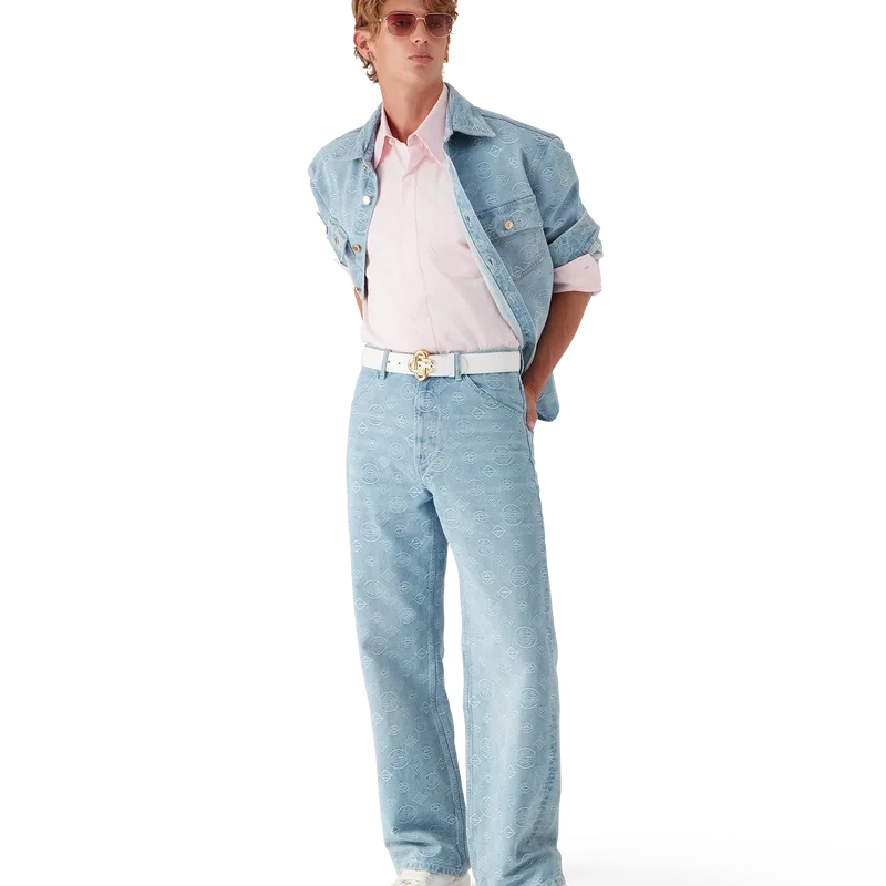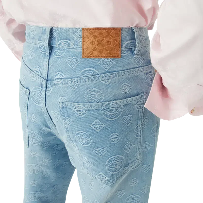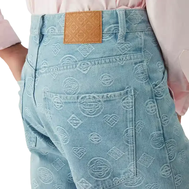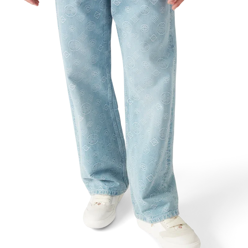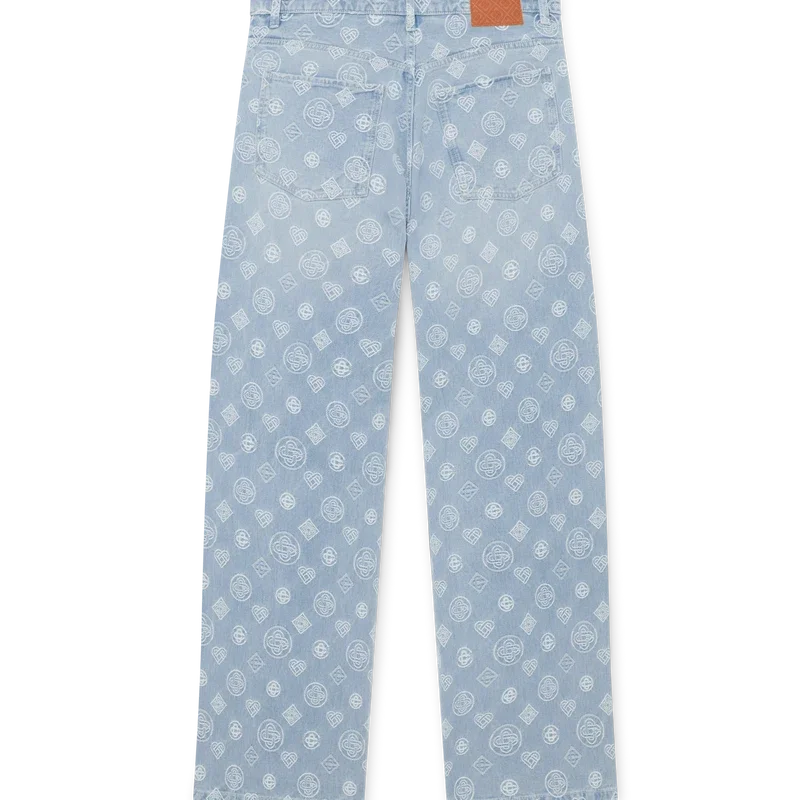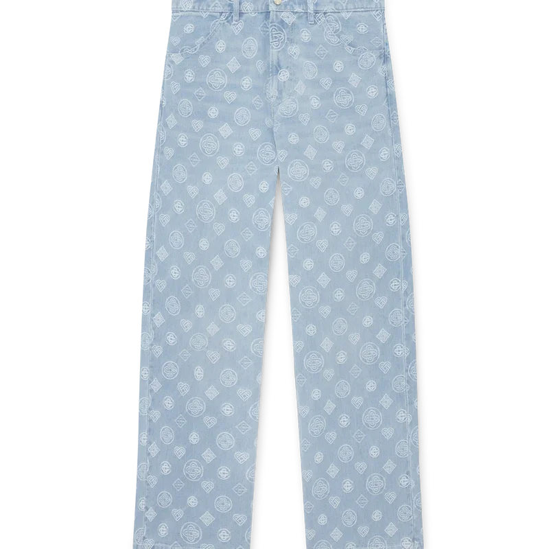 As calças de ganga Monogram de corte descontraído apresentam um design clássico de perna reta com o logótipo Honeydew da marca repetido. Este padrão difere dos nossos outros monogramas, uma vez que combina formas únicas para formar um padrão coeso. Completadas com presilhas para cinto, fecho de correr, bolsos inclinados, bolsos de remendo traseiros e ferragens banhadas a ouro.