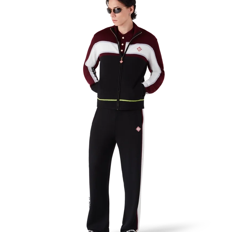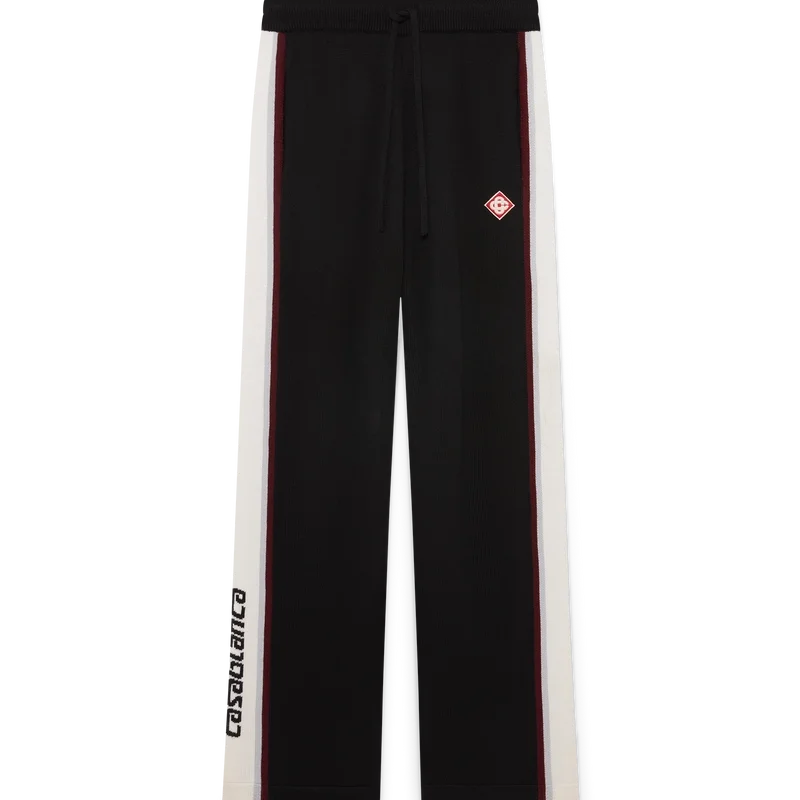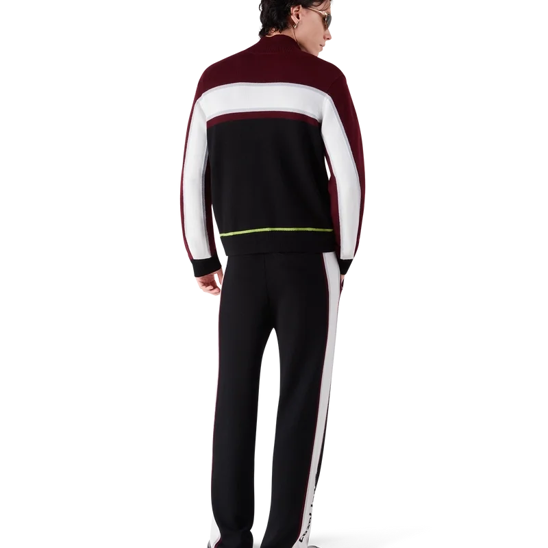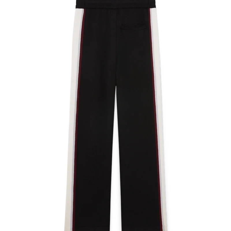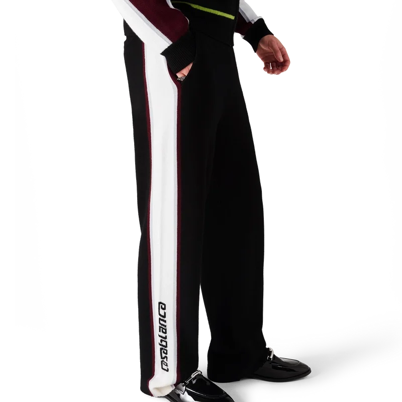 As calças de malha merino às riscas apresentam um design sofisticado, confeccionadas em lã merino com uma construção em malha texturada. Acabamento com cintura elástica e silhueta descontraída que equilibra o conforto desportivo com um corte refinado.