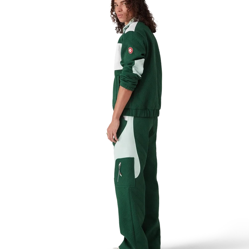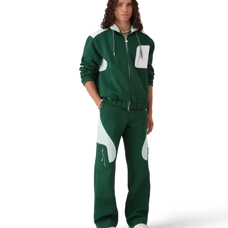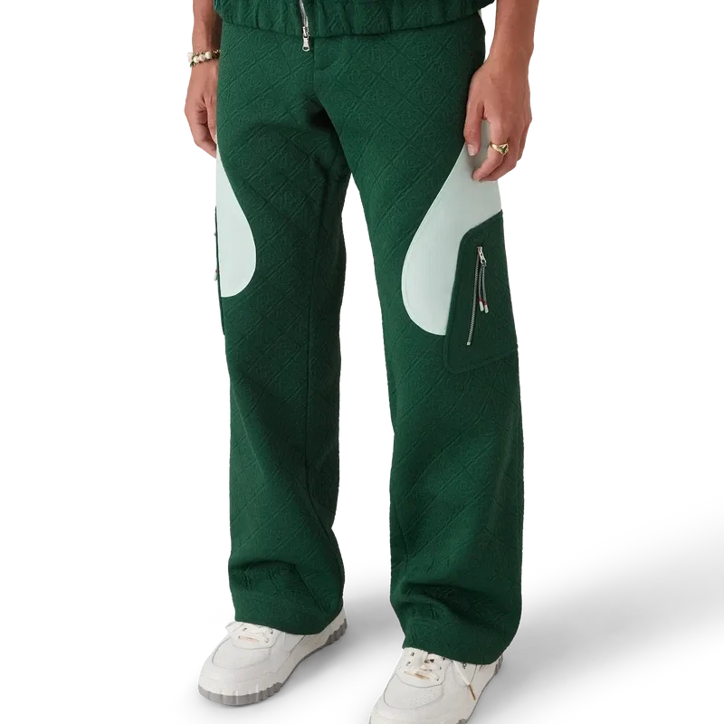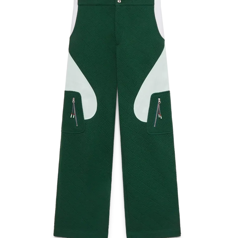 As calças em malha jacquard Monogram apresentam um corte reto com painéis em blocos de cores contrastantes. Completam-se com uma cintura com um botão de pressão banhado a ouro com a marca, fecho de correr, painéis laterais contrastantes, bolsos frontais inclinados e bolsos laterais de remendo com fechos de correr verticais e cordões inspirados em cordas de alpinismo.