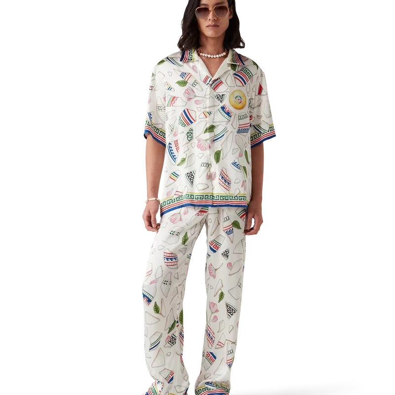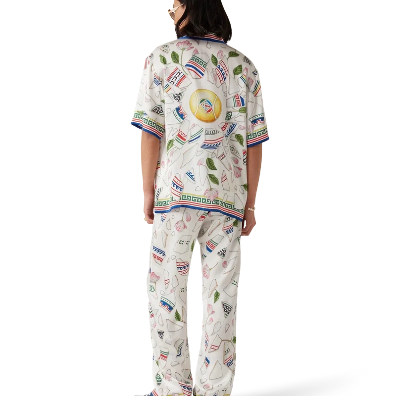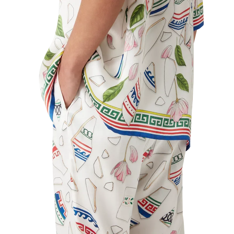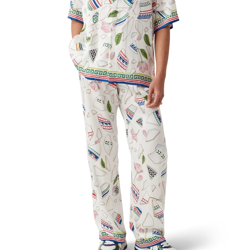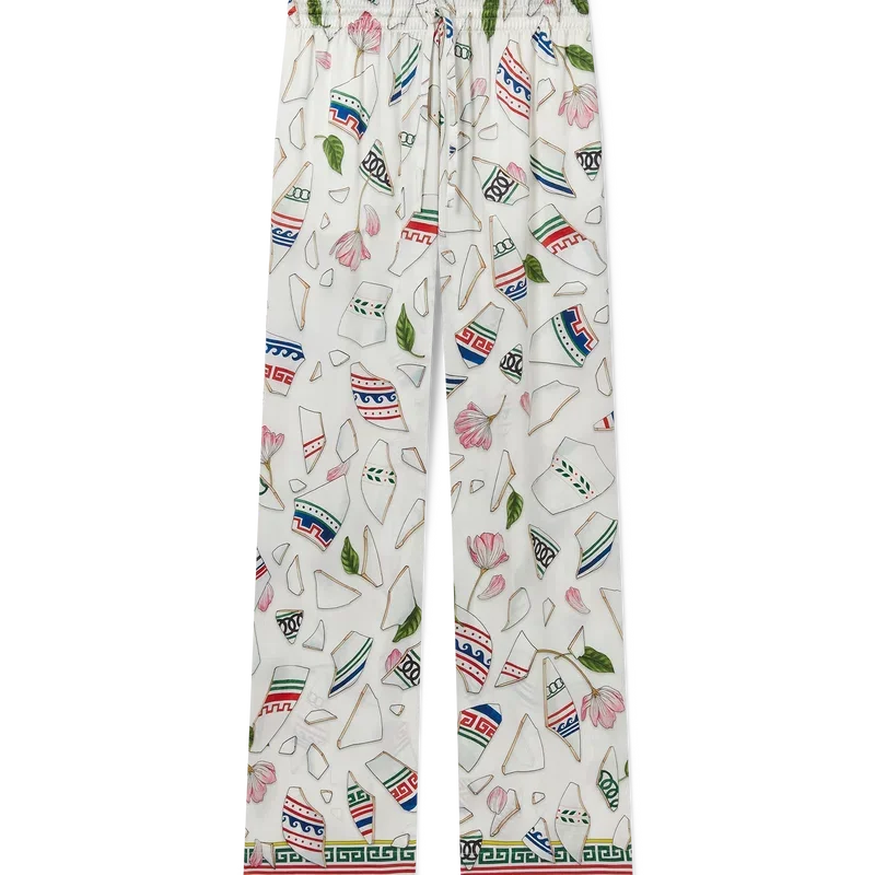 As calças de seda Le Vase Brise apresentam um padrão estampado em toda a peça, confeccionadas em tecido de cetim de seda com a estampa sazonal da marca, inspirada no estudo contínuo da beleza clássica e do encanto contemporâneo da Grécia Antiga. Completadas com uma cintura elástica, bolsos laterais nas costuras, um bolso de remendo nas costas, fecho com cordão e detalhes inspirados no padrão grego na bainha.