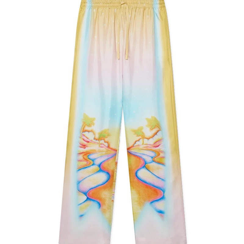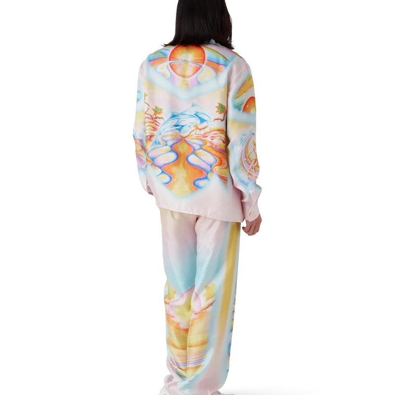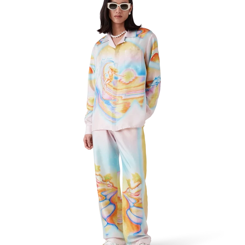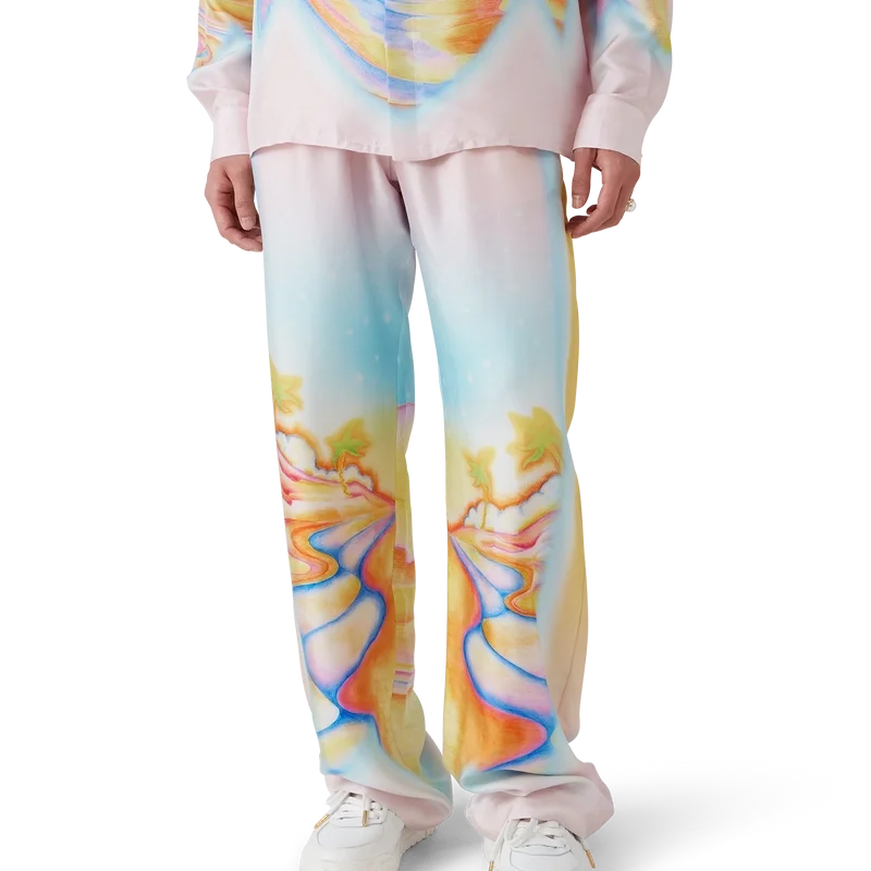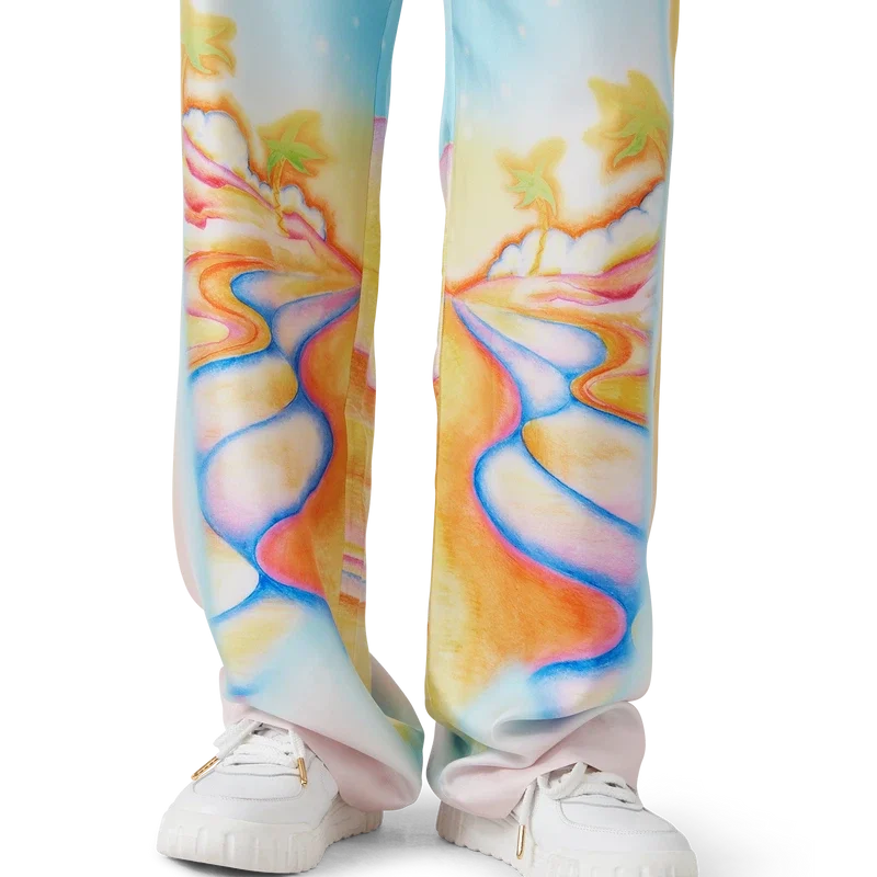 As calças de seda Psychedelic Nirvana apresentam um padrão estampado em toda a superfície, confeccionadas em tecido de sarja de seda com um desenho inspirado nas pranchas de surf californianas dos anos 70 pintadas com aerógrafo, utilizando cores pastel que conferem à estampa uma sensação quase onírica e idealista. Apresentam um cós elástico, fecho com cordão, bolsos laterais nas costuras e um bolso de remendo nas costas.