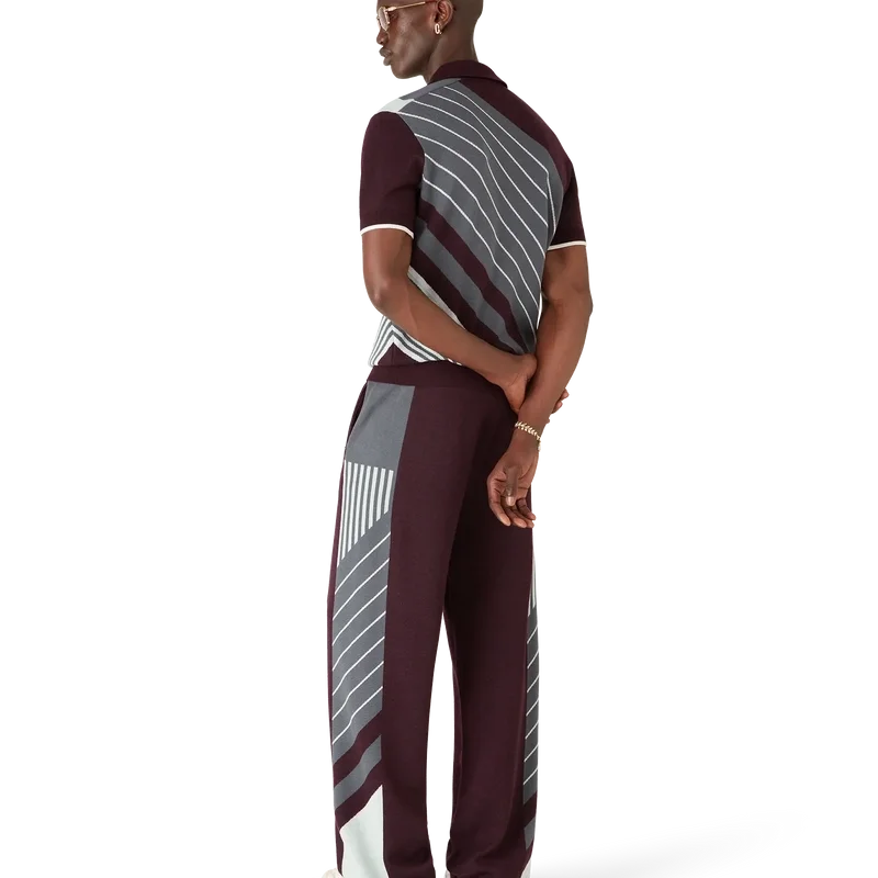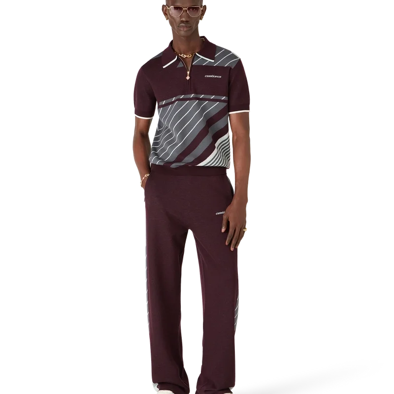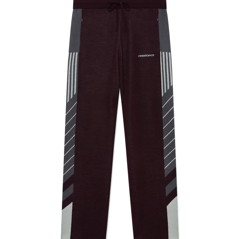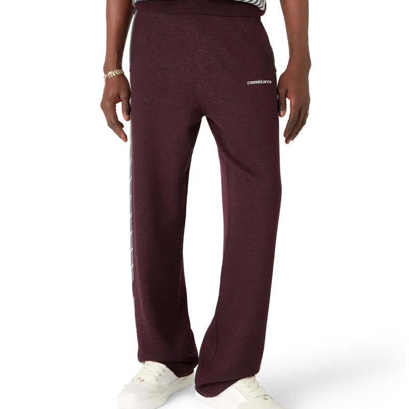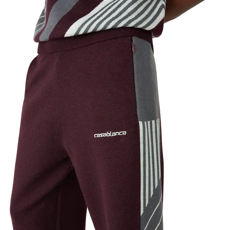 As Calças de Ténis Merino Diagonal apresentam um design de malha com perna reta e o logótipo Casablanca bordado. Completam-se com uma cintura elástica, bolsos laterais com fecho de correr, detalhes de riscas diagonais nas laterais e fecho com cordão.