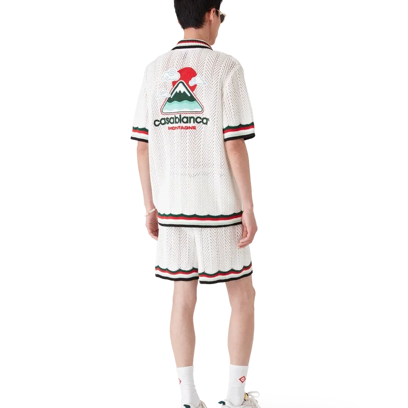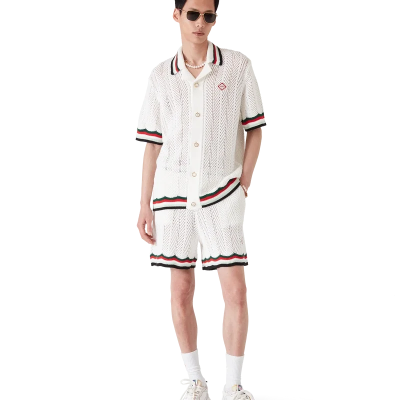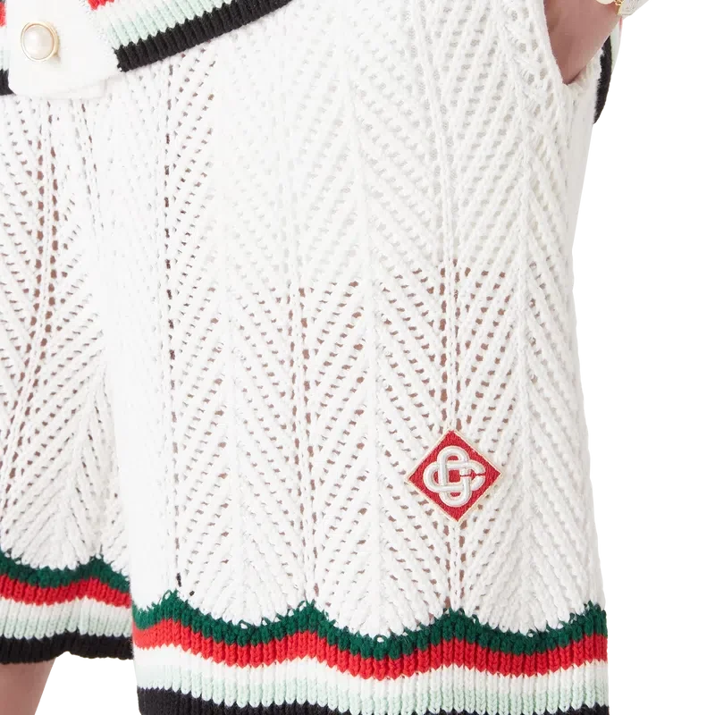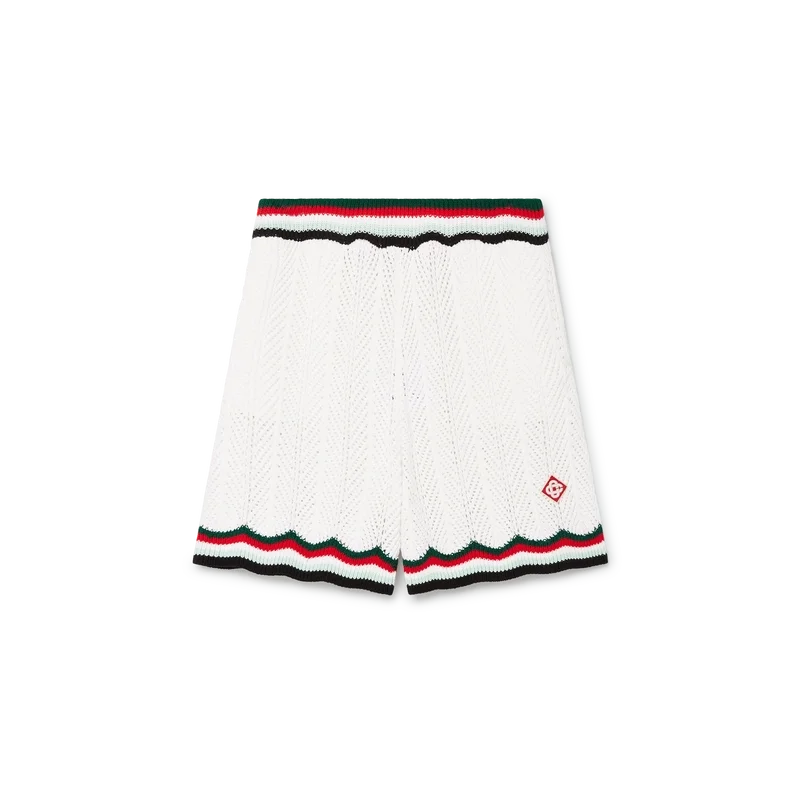 Os calções de croché com padrão em ziguezague são um modelo clássico confeccionado em tecido de algodão de croché com um padrão em ziguezague e o logótipo em diamante característico da marca. Completam-se com uma cintura elástica, bolsos nas costuras e detalhes de riscas na bainha e na cintura.