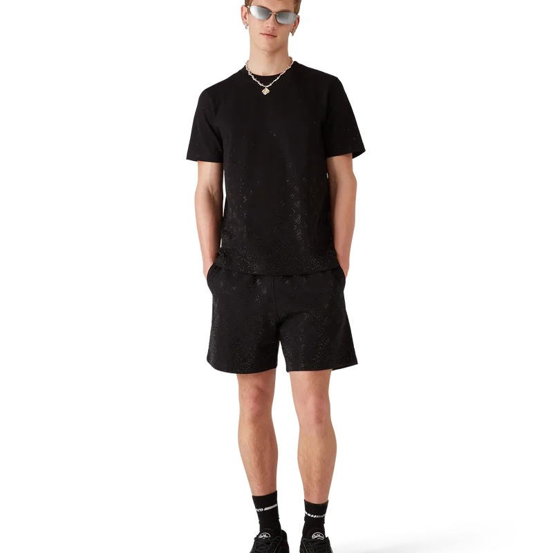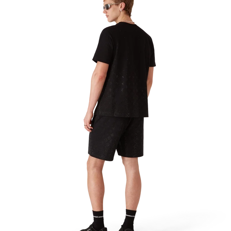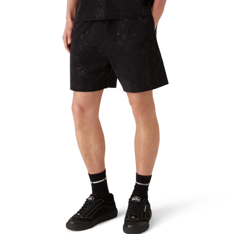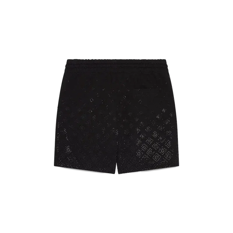 Os calções de treino com monograma de cristais apresentam um design sofisticado em jersey com o monograma degradê da marca, trabalhado em cristais. Completam-se com uma cintura elástica, cordão com pontas prateadas, bolsos laterais e um bolso traseiro.