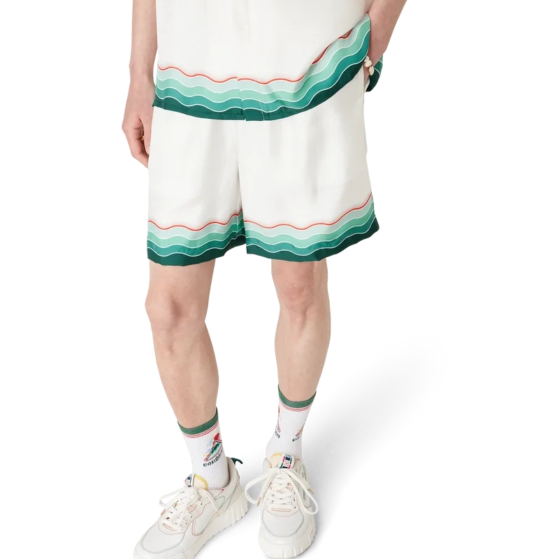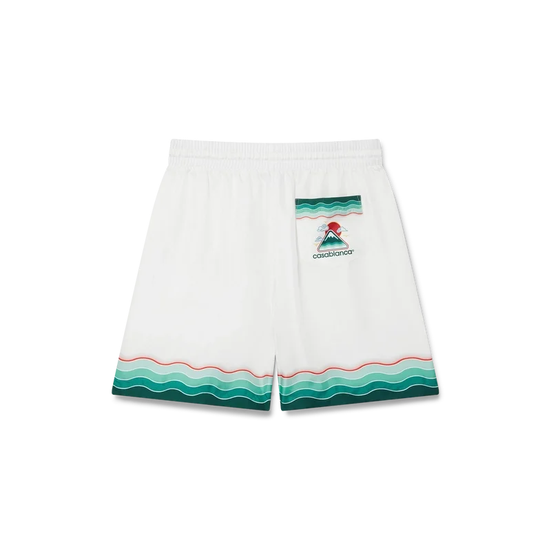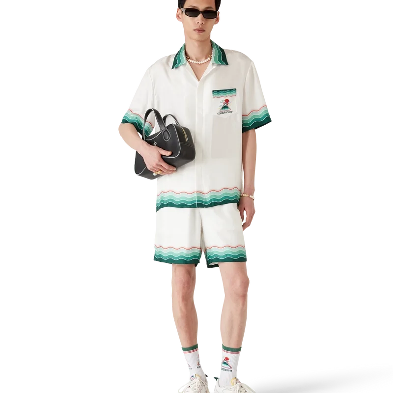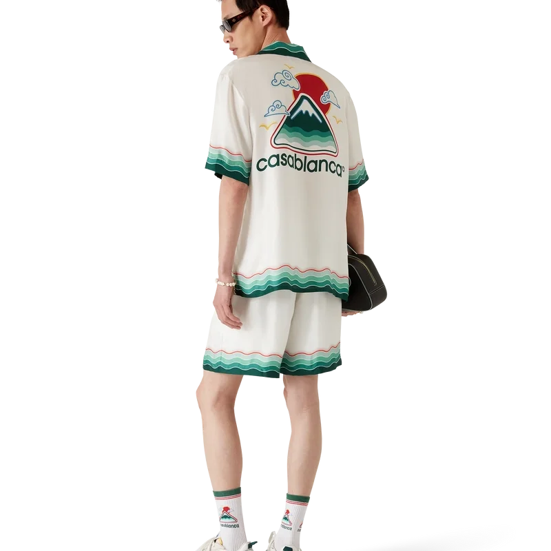 A camisa de seda Montagne Ondulee é um modelo de manga curta com estampado integral, apresentando a arte sazonal da marca — utilizando a rica iconografia japonesa como inspiração para esta coleção, com um layout e arte simples, transmitindo uma forte mensagem visual com apenas algumas linhas e cores, tornando-a um dos emblemas da coleção — confeccionada em tecido de sarja de seda. Completado com uma cintura elástica, fecho com cordão, bolsos laterais nas costuras, um bolso traseiro e detalhes de riscas inspiradas na onda de Memphis na bainha e no bolso traseiro.