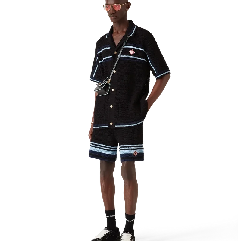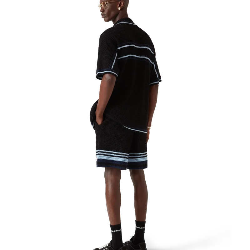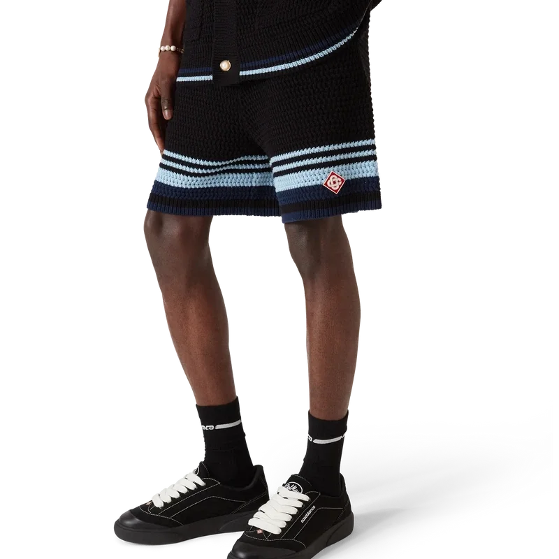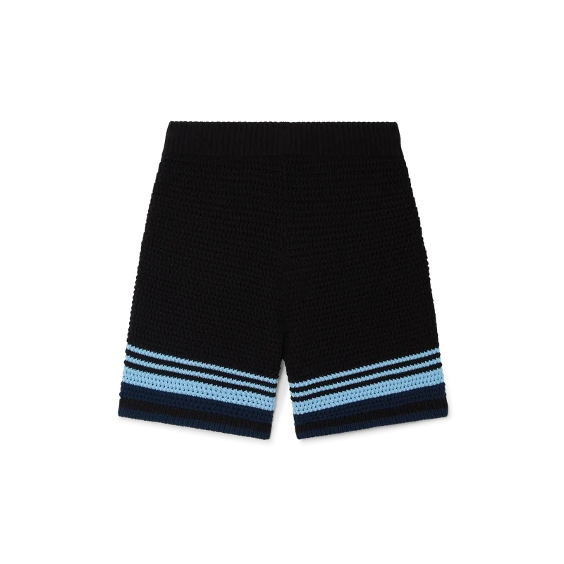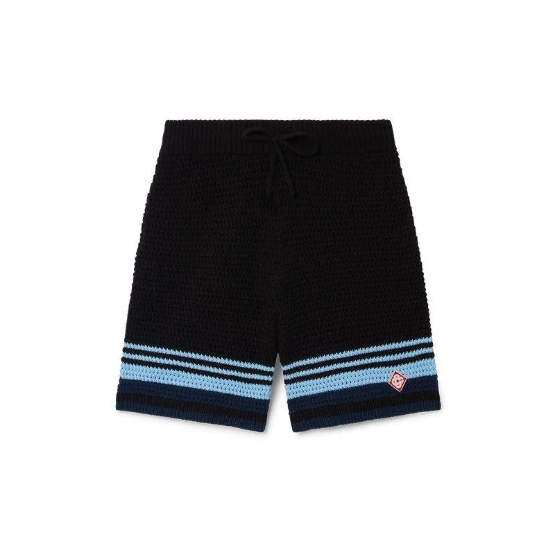 Os calções de croché apresentam um design requintado com textura suave, com o logótipo de diamante característico da marca. Acabamento com cintura elástica canelada com cordão de aperto, bolsos laterais, detalhes de riscas contrastantes nas pernas e uma silhueta descontraída.