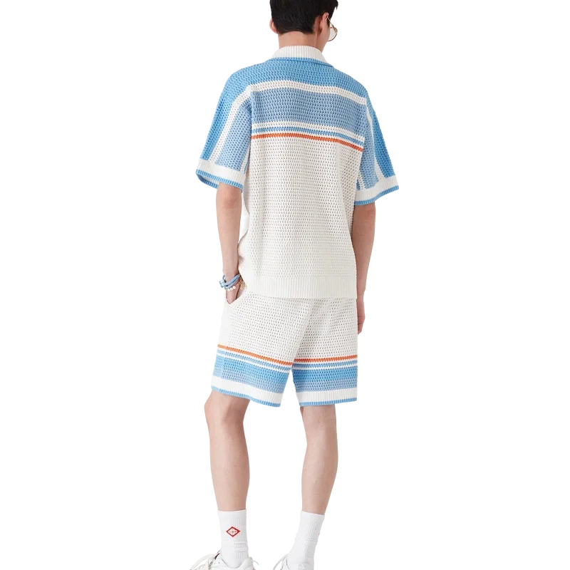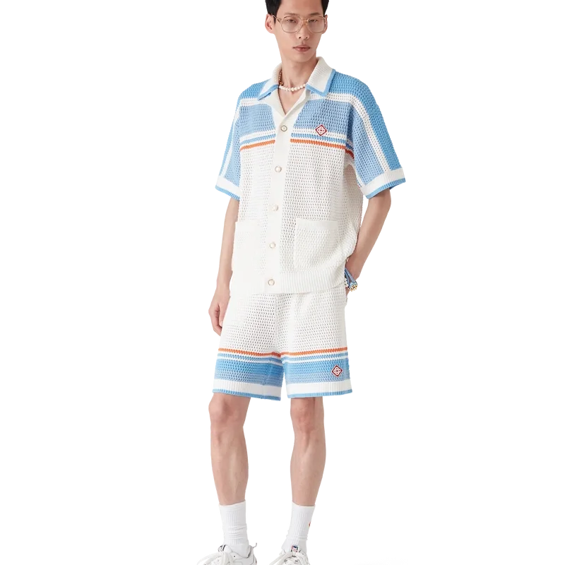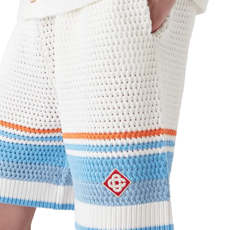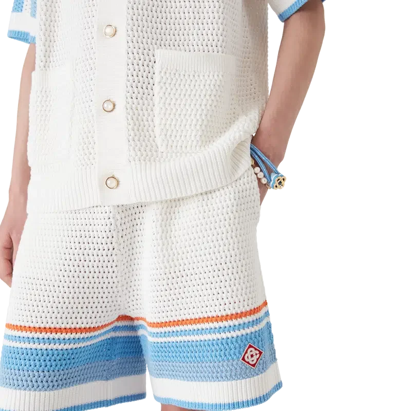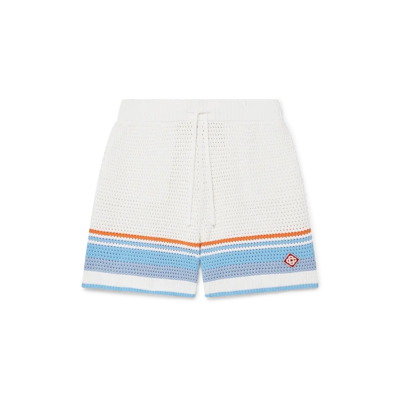 Os calções de ténis em croché apresentam um design clássico, confeccionados em tecido de algodão em croché em tons naturais suaves, com o logótipo de diamante característico da marca. Completam-se com uma cintura elástica, bolsos nas costuras e detalhes de bainha às riscas.