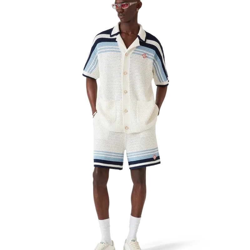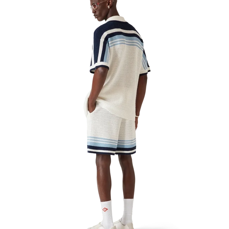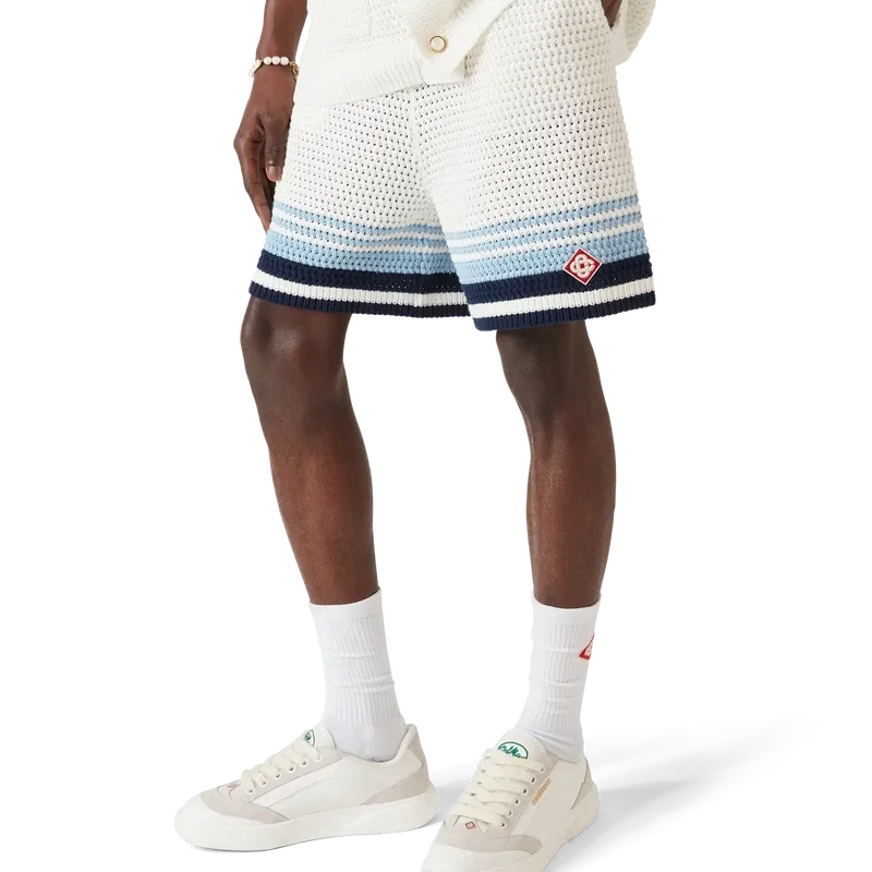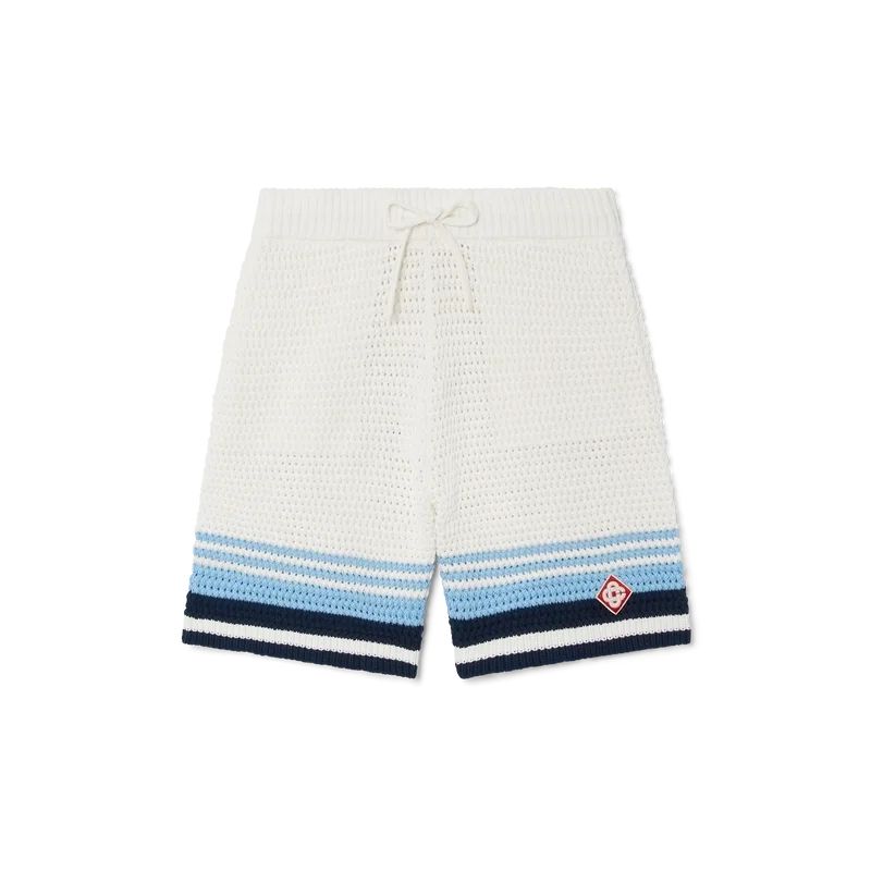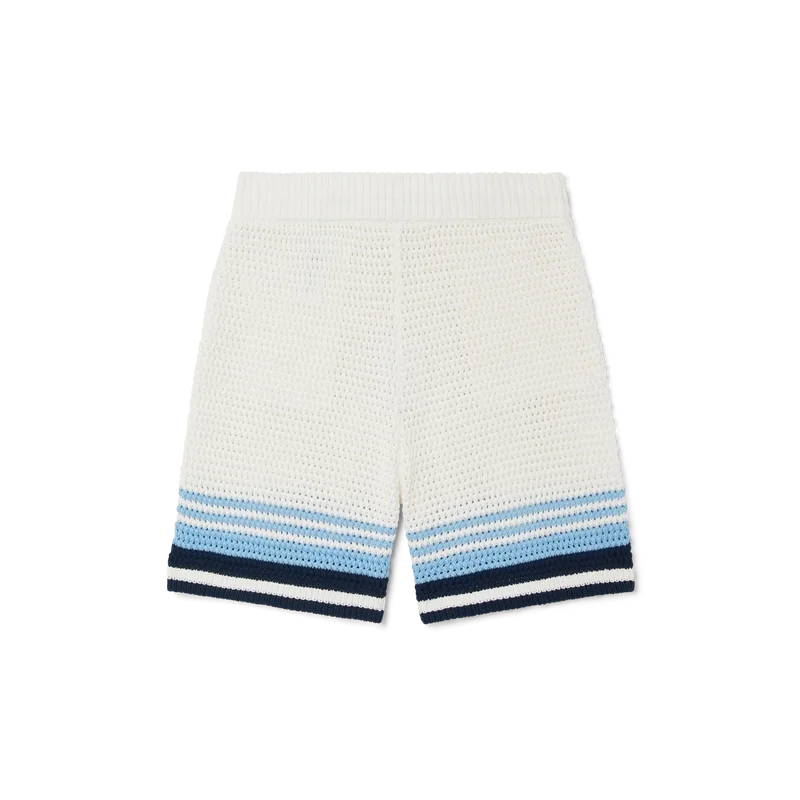 Os calções de croché apresentam um design requintado e de textura suave, confeccionados em tecido de algodão de croché, com o design exclusivo de riscas de ténis em cores naturais que criam um efeito de gradiente.