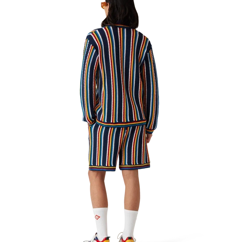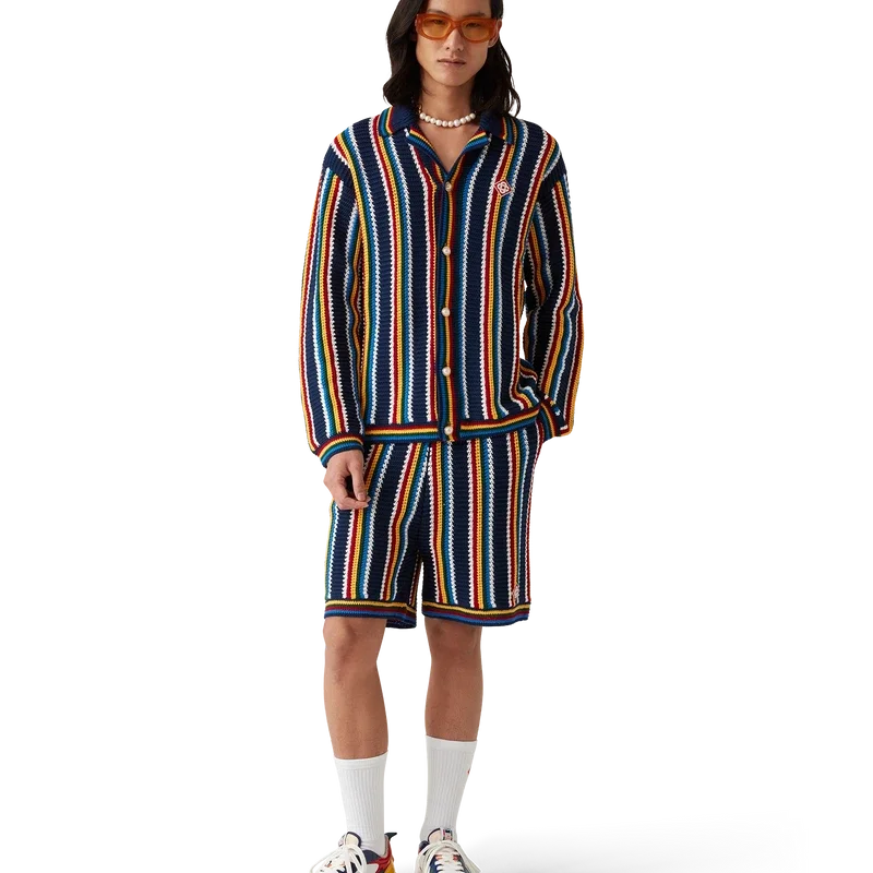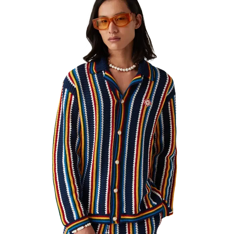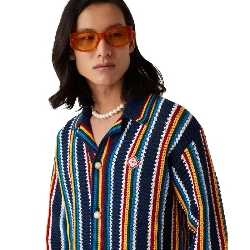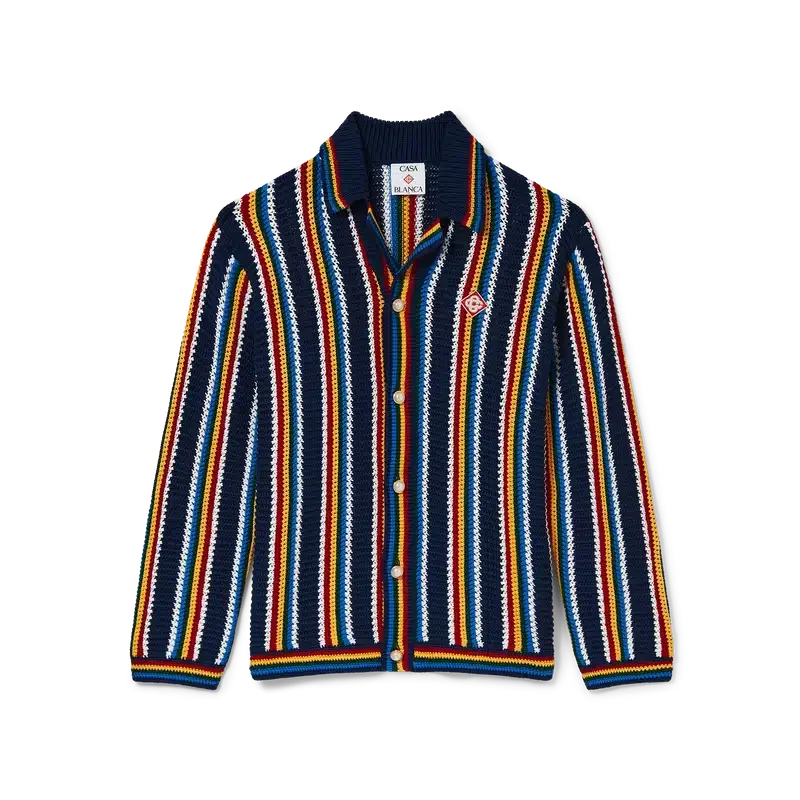 A camisa de croché às riscas é um modelo de manga comprida com riscas e textura, confeccionada em tecido de croché de algodão e com o logótipo de diamante característico da marca. Apresenta gola, punhos, bainha e carcela em malha canelada, botões de pérola com aro dourado característicos e fecho de botões à frente.