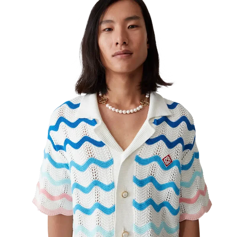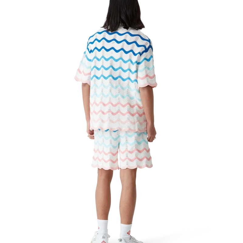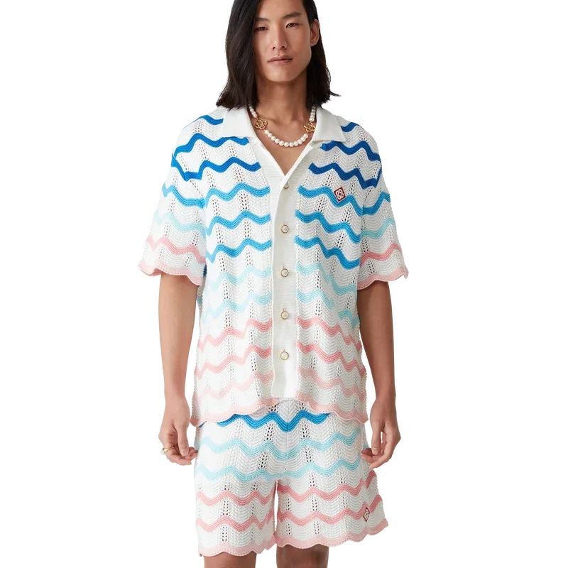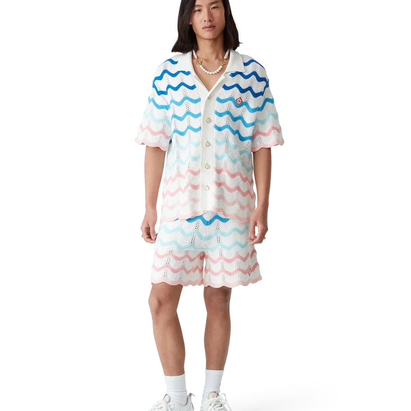 A Camisa de Croché Gradient Wave é um modelo de manga curta confeccionado em tecido de algodão de croché e apresenta o elemento de design inspirado na onda de Memphis. Completa-se com fecho de botões, o logótipo de diamante da marca, uma gola cubana, botões de pérola com aro dourado e detalhes de borda com padrão de ondas.