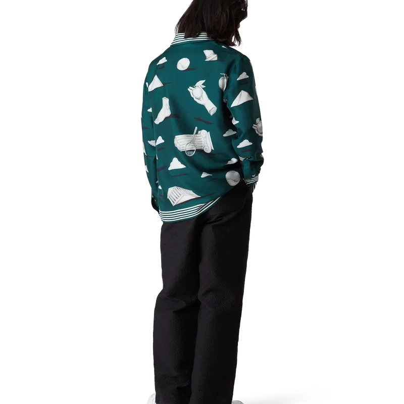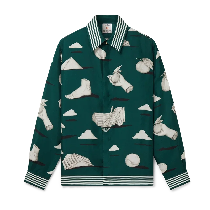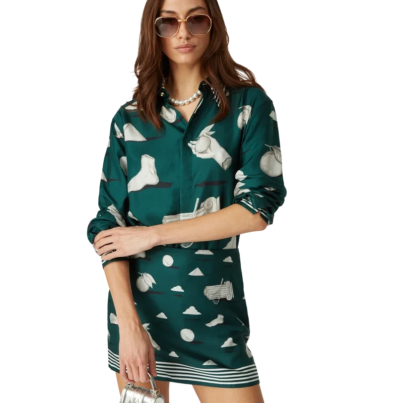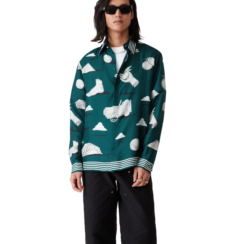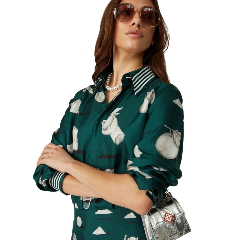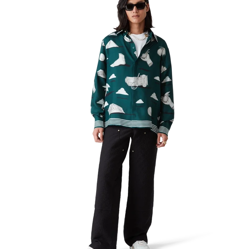 A camisa de seda Metaphysical apresenta um design estampado em toda a peça, confeccionada em tecido de sarja de seda, com ilustrações que retratam os elementos centrais do design. Completada com botões esmaltados com aro dourado exclusivos nos punhos e na gola, fecho frontal com botões de corozo entrelaçados, gola em bico e detalhes de riscas na gola, nos punhos e na bainha.