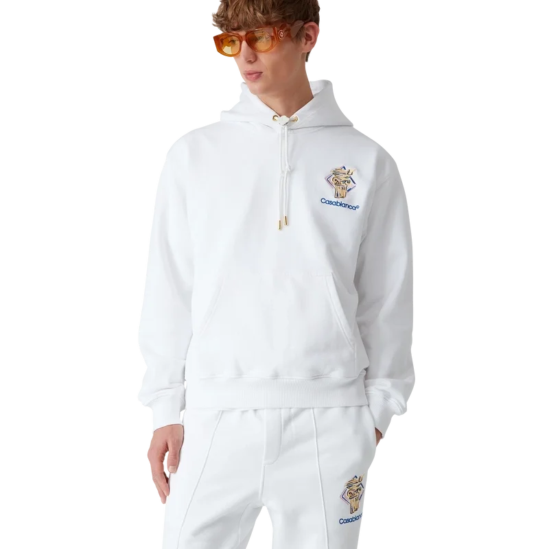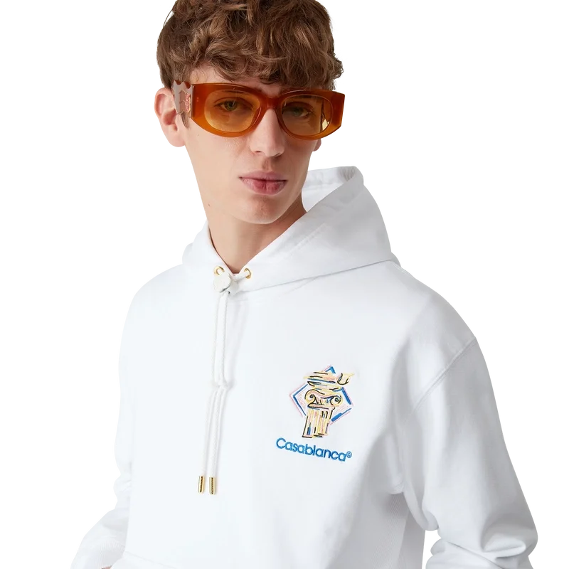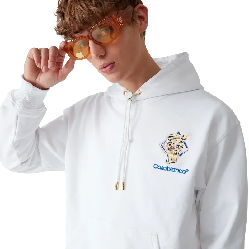 A Camisola com Capuz Diamond Column é um modelo clássico de manga comprida, confeccionado em tecido de algodão orgânico e decorado com a iconografia da coluna, um dos símbolos da marca. Apresenta um capuz com cordão com pontas douradas para um fecho seguro, um bolso canguru na frente, punhos e bainha em canelado.