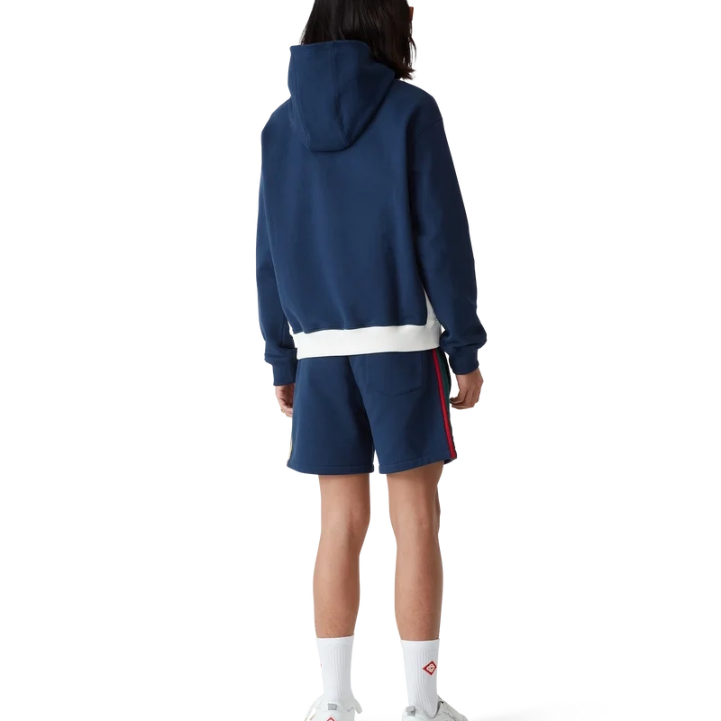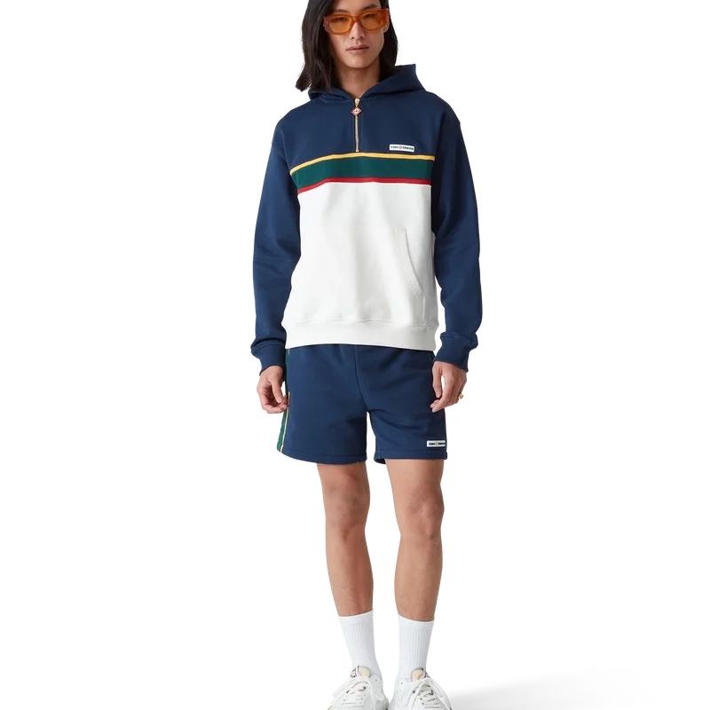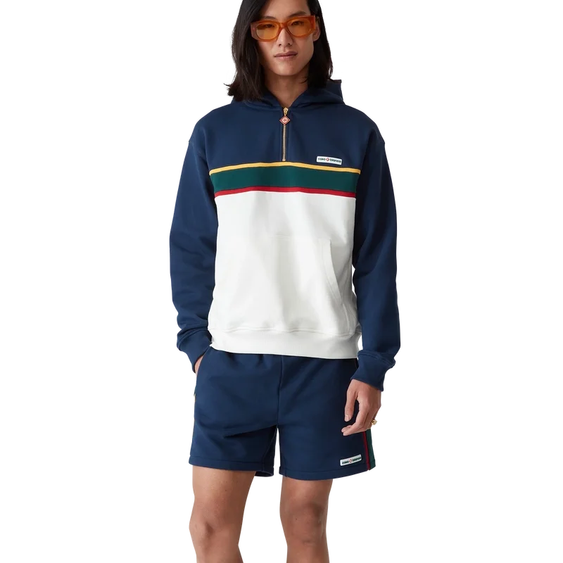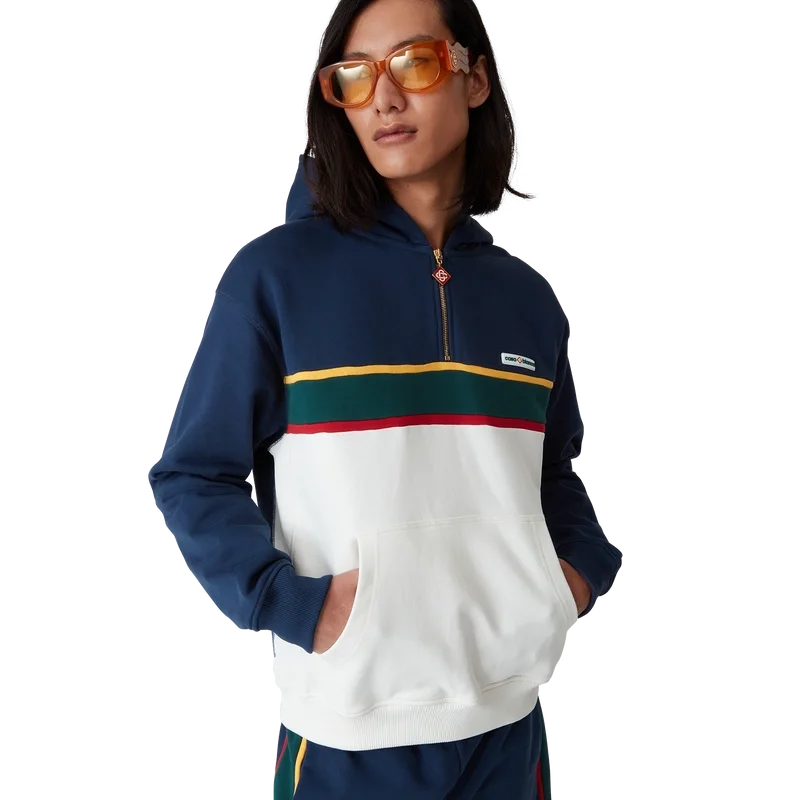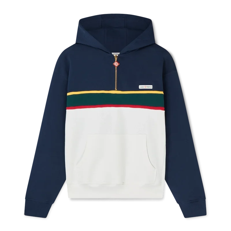 A camisola com capuz e fecho de correr de um quarto com blocos de cor é uma peça de roupa desportiva de manga comprida confecionada em tecido de malha de algodão orgânico. Apresenta capuz, cordão com pontas douradas para um fecho seguro, painéis contrastantes, bolso canguru na frente e punhos e bainha canelados.
