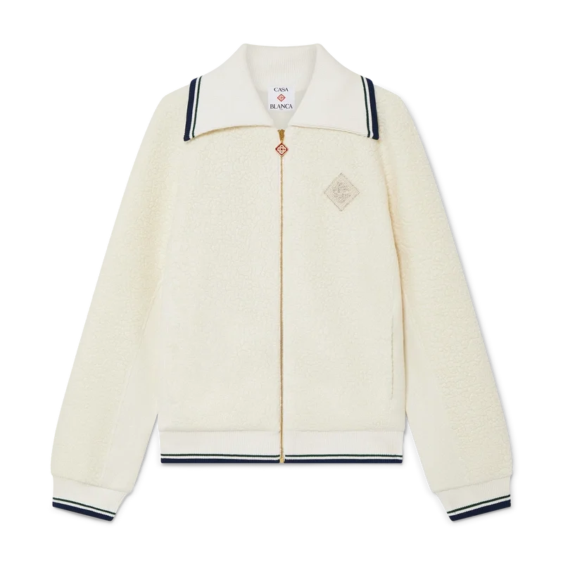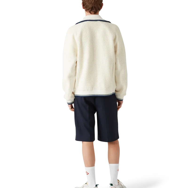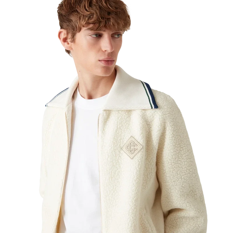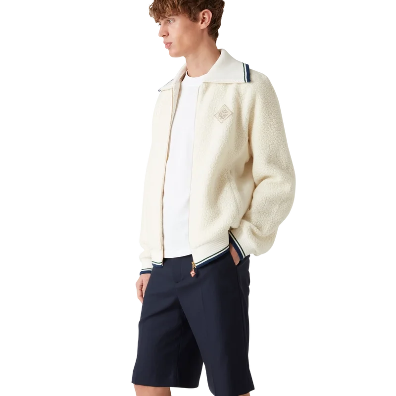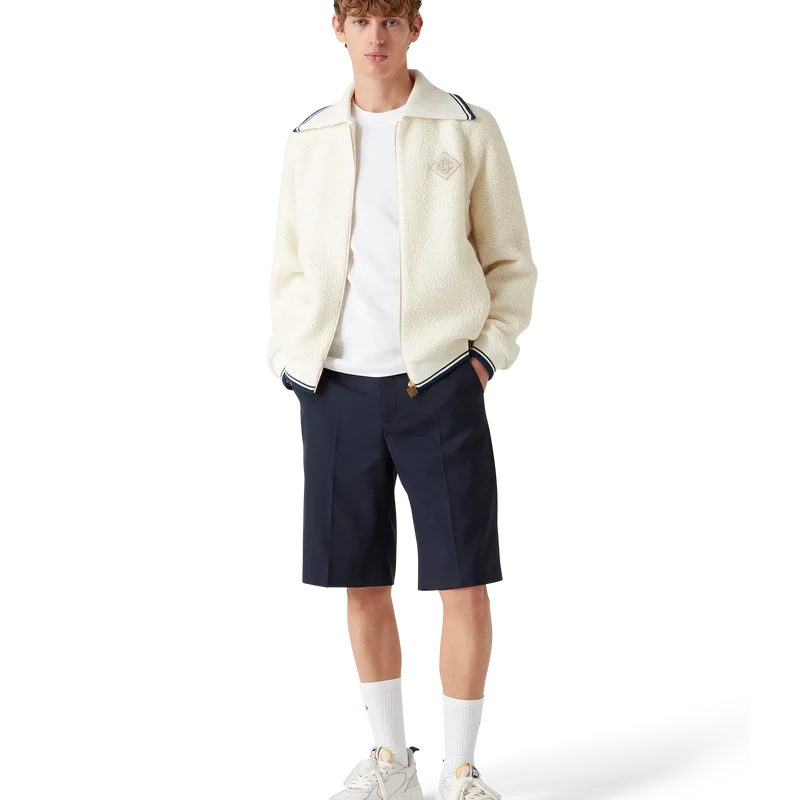 A camisola com fecho em caxemira é um modelo de manga comprida confeccionado em tecido de mistura de caxemira. Apresenta fecho de correr, o logótipo em diamante da marca — reinterpretado para esta estação —, forro, bolsos laterais, gola, punhos e bainha canelados com detalhes às riscas.