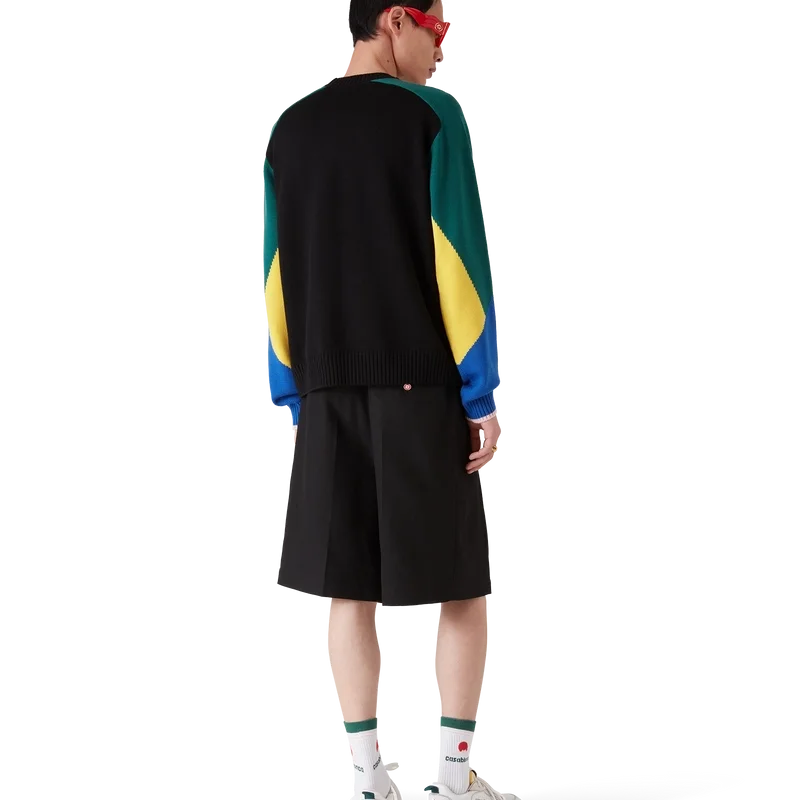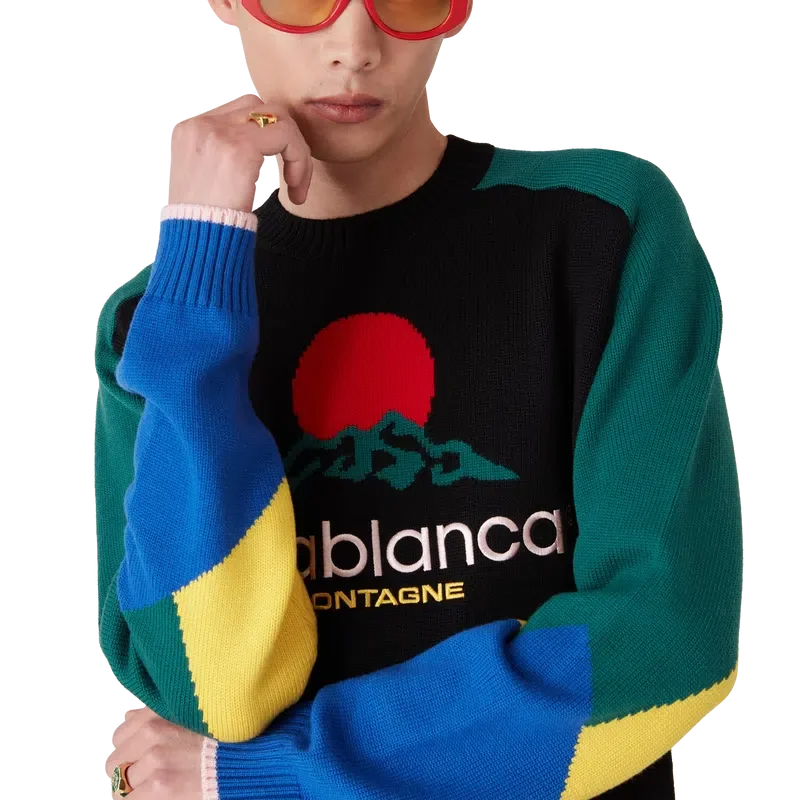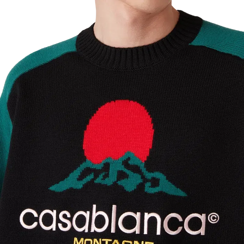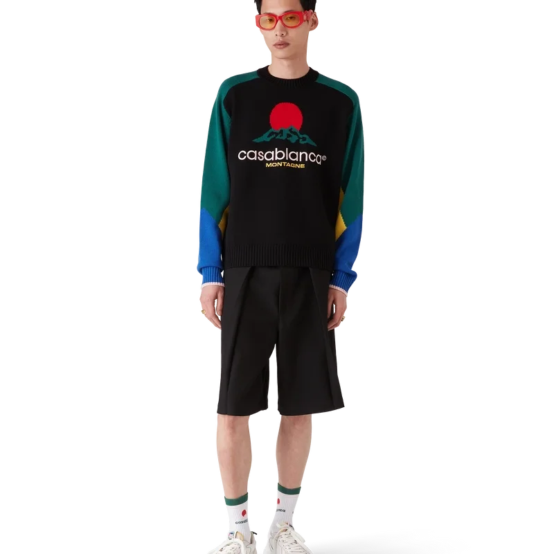 A Camisola Montagne Merino é um modelo de malha de manga comprida confeccionado em tecido de algodão. Apresenta o logótipo Casa Montagne — um logótipo que à primeira vista parece uma montanha, mas que, ao olhar mais de perto, se lê como Casa — no peito, punhos canelados com detalhes nas bordas e um clássico decote redondo.