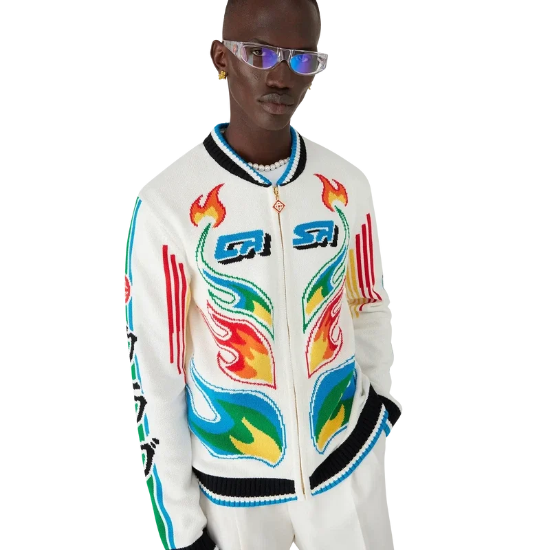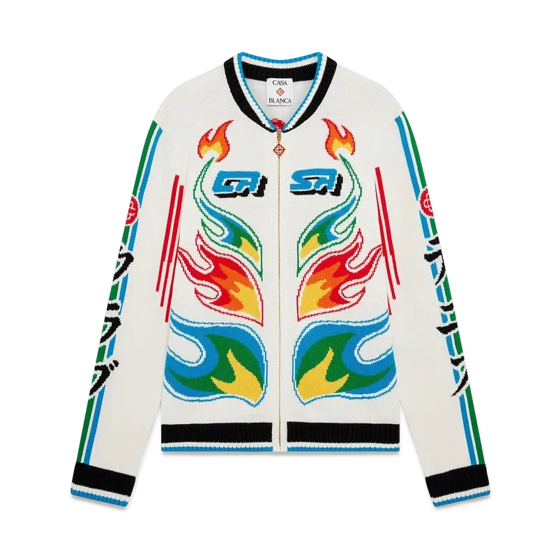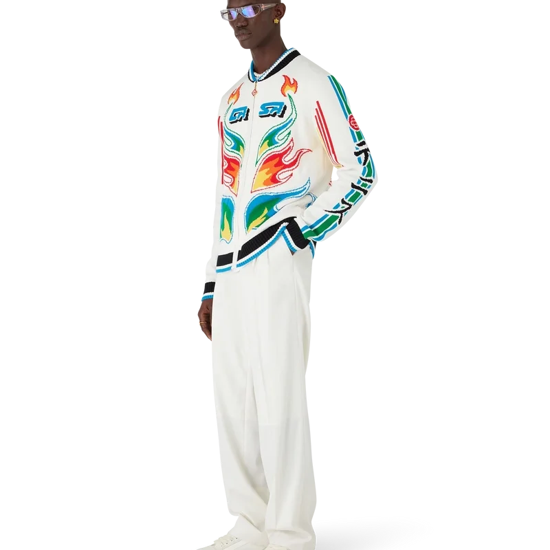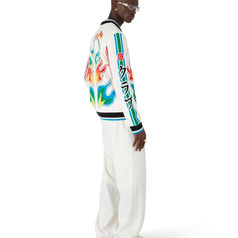 O Casaco Casa Club em malha de algodão Flame Laurel é um modelo de manga comprida que apresenta a arte Flames da estação, uma versão atualizada da arte Laurel — presente na nossa coleção nigeriana Primavera-Verão ’24 —, brincando com os gráficos marcantes encontrados nos equipamentos de futebol japoneses vintage. Completado com um fecho de correr com a aba com o logótipo de diamante característico da marca, o logótipo Cc entrelaçado, um detalhe de riscas azuis, brancas e verdes ao longo das mangas e detalhes em canelado preto, branco e azul nos punhos, bainha e gola estilo basebol.
