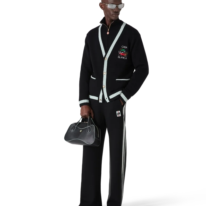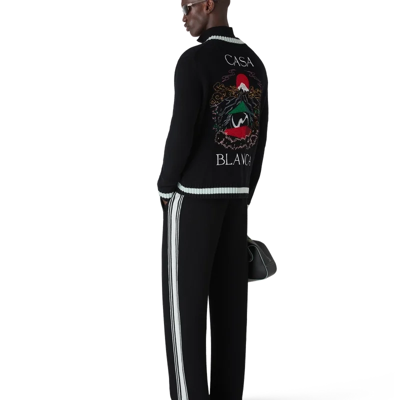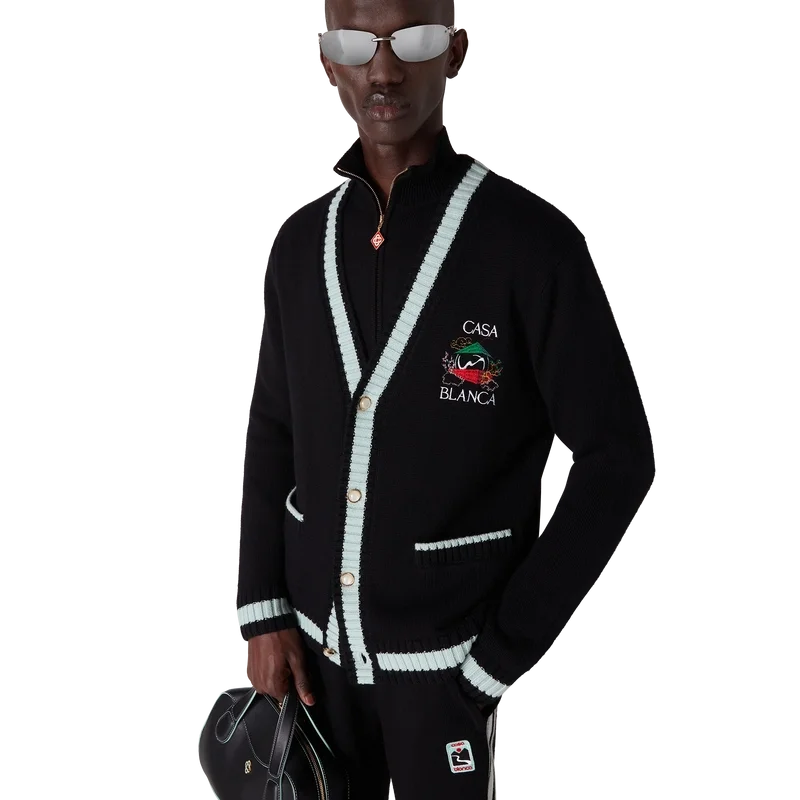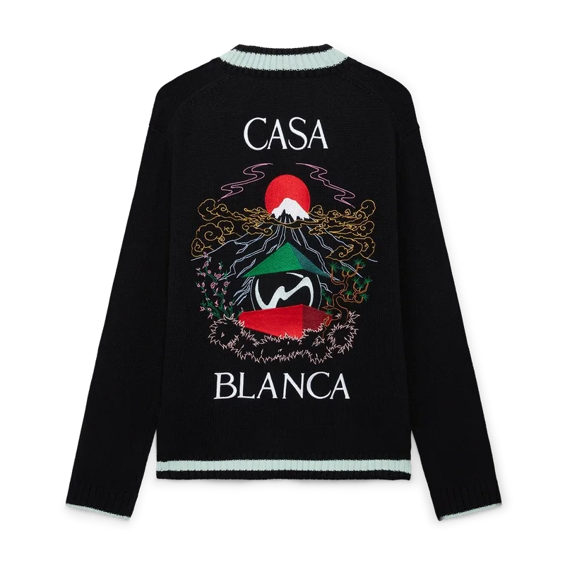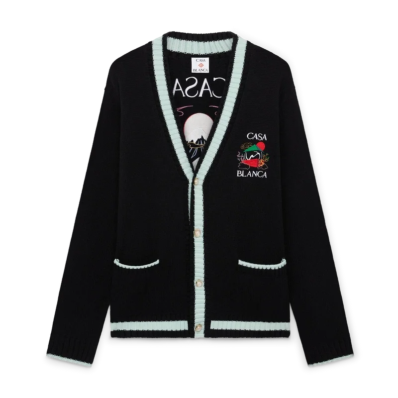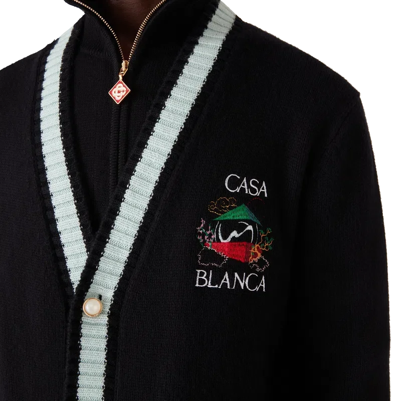 O Casa Mountain Temple Cardigan é um modelo de manga comprida com motivos sazonais bordados, confecionado em tecido de lã merino. Apresenta um clássico decote redondo, punhos e bainha canelados.