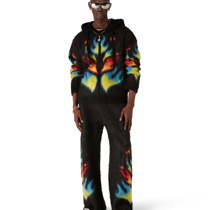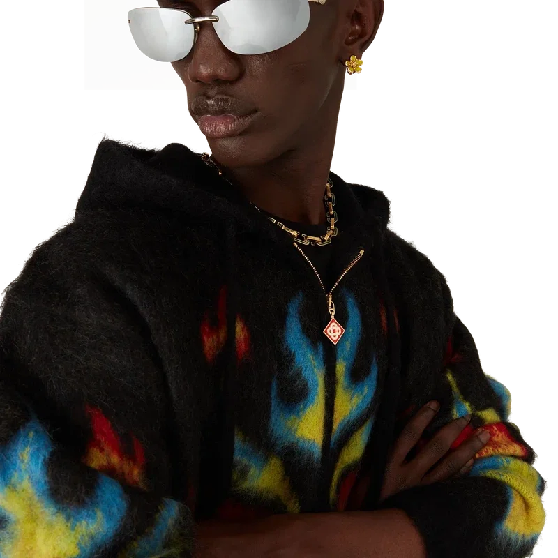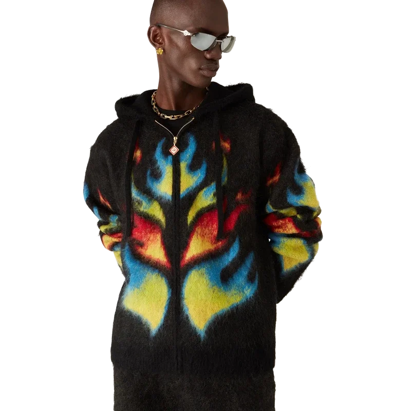 O Casaco com Capuz e Fecho de Correr Mohair Flame Laurel é um modelo de malha de manga comprida que apresenta uma versão atualizada do nosso Top Laurel da coleção nigeriana, inspirando-se nos gráficos arrojados das camisolas de futebol. Completo com fecho de correr, capuz com cordão de aperto, punhos e bainha canelados.