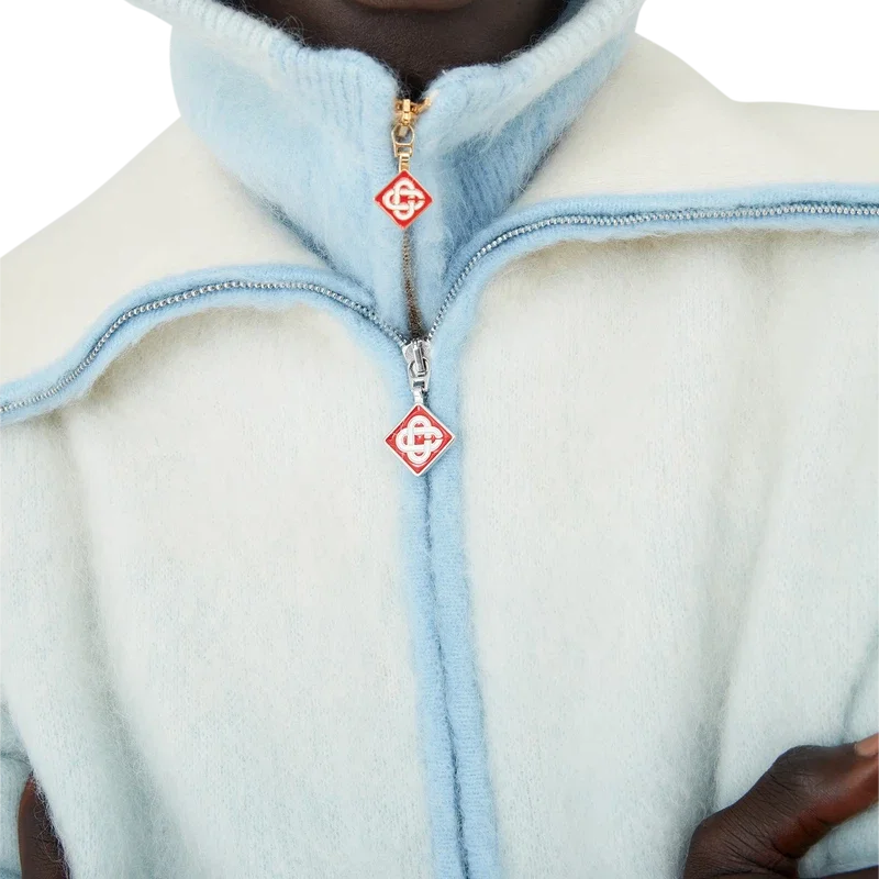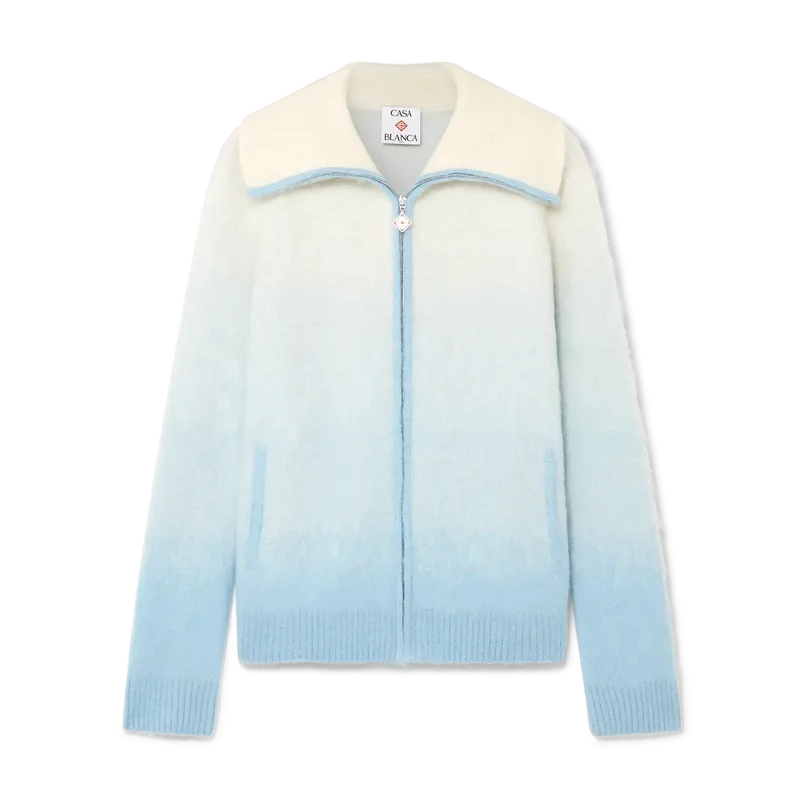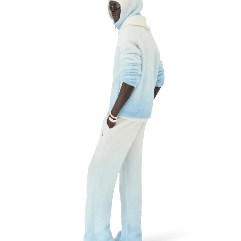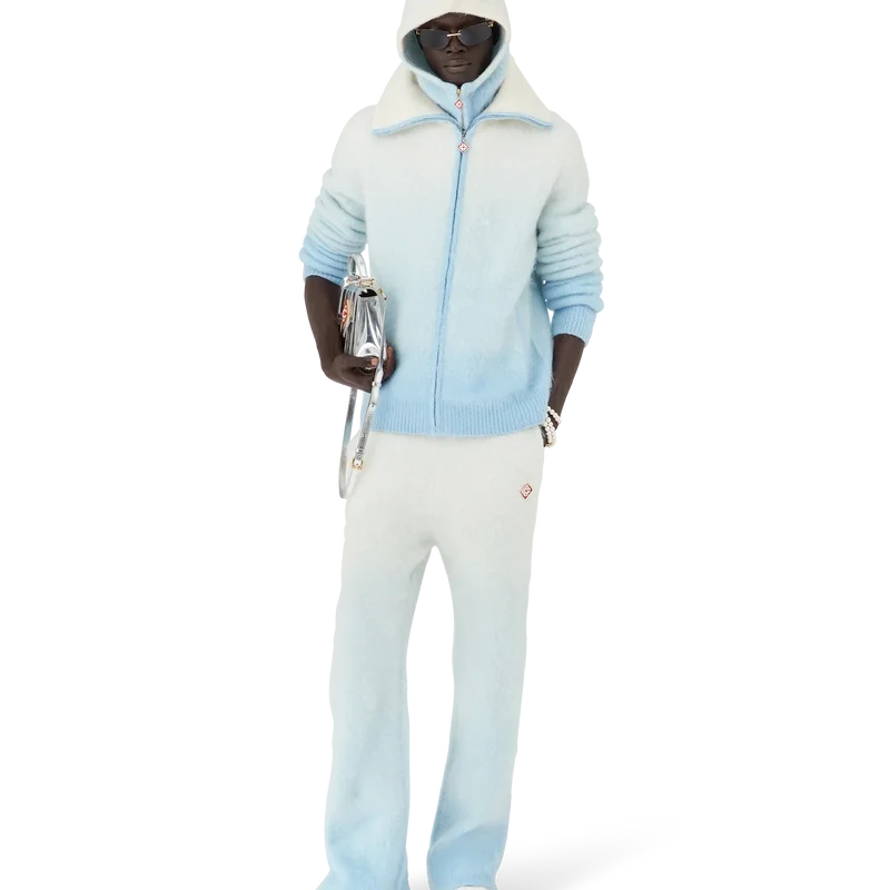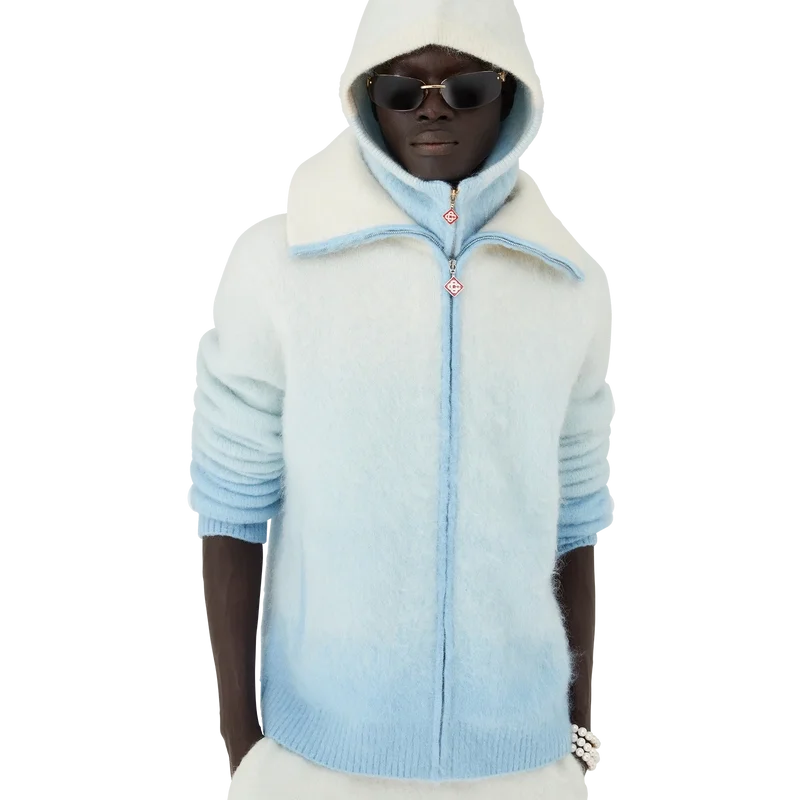 O casaco de esqui é um design desportivo-casual requintado, confecionado em tecido misto de mohair, com um gradiente azul e branco inspirado no crepúsculo sobre a paisagem rural coberta de neve do Japão. Evoca a transição em que a luz do dia que se desvanece se encontra com a neve recém-caída nos vales montanhosos rurais e nos riachos gelados que serpenteiam pelas terras agrícolas de Hokkaido.