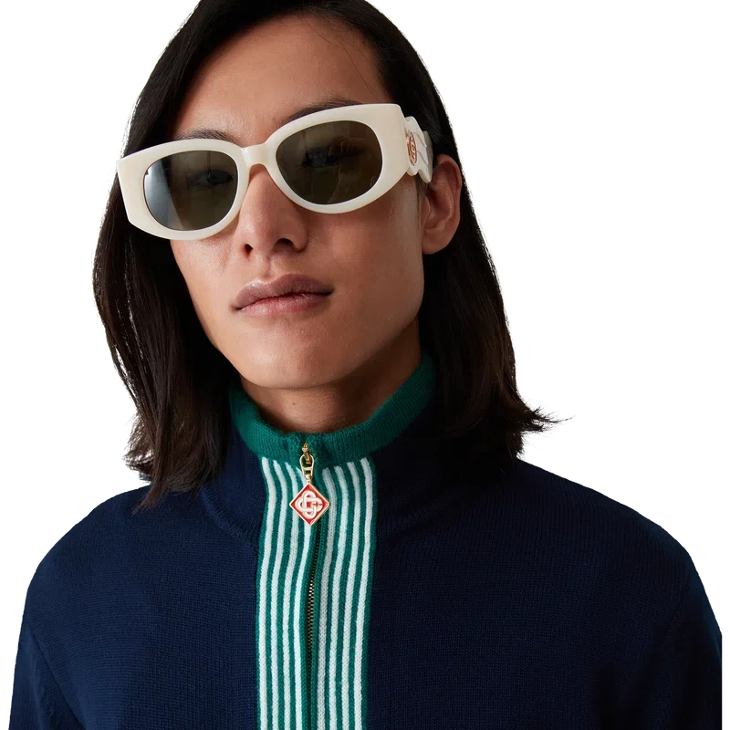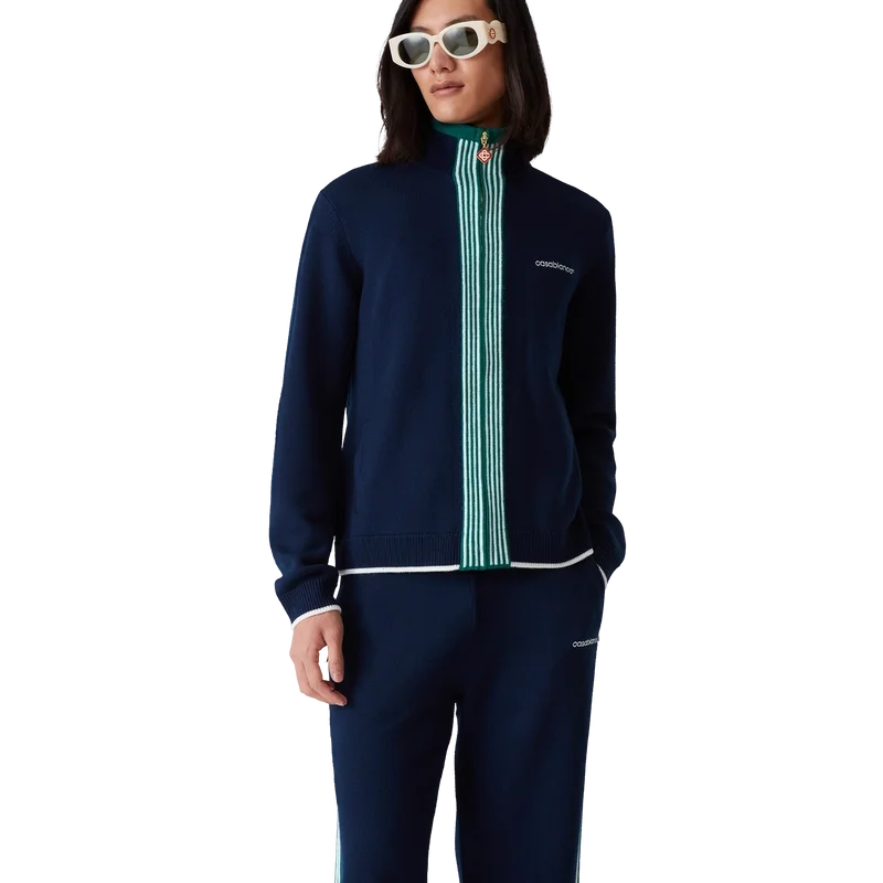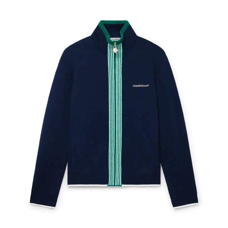 O Casaco de Treino de Ténis em Malha apresenta um design clássico, confecionado em tecido de lã merino. Apresenta detalhes de bordas caneladas contrastantes nos punhos, bainha, carcela e gola em funil, fecho de correr frontal e logótipo Casablanca.