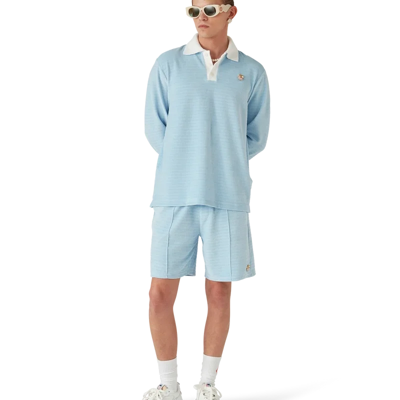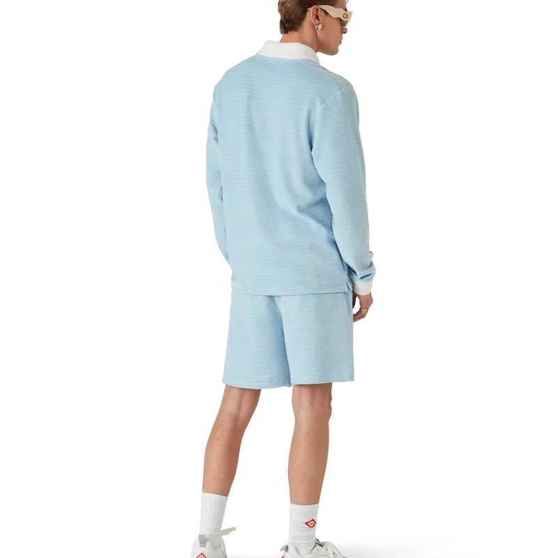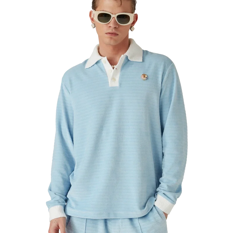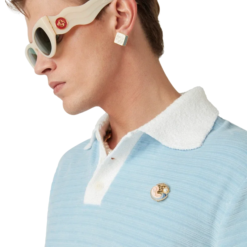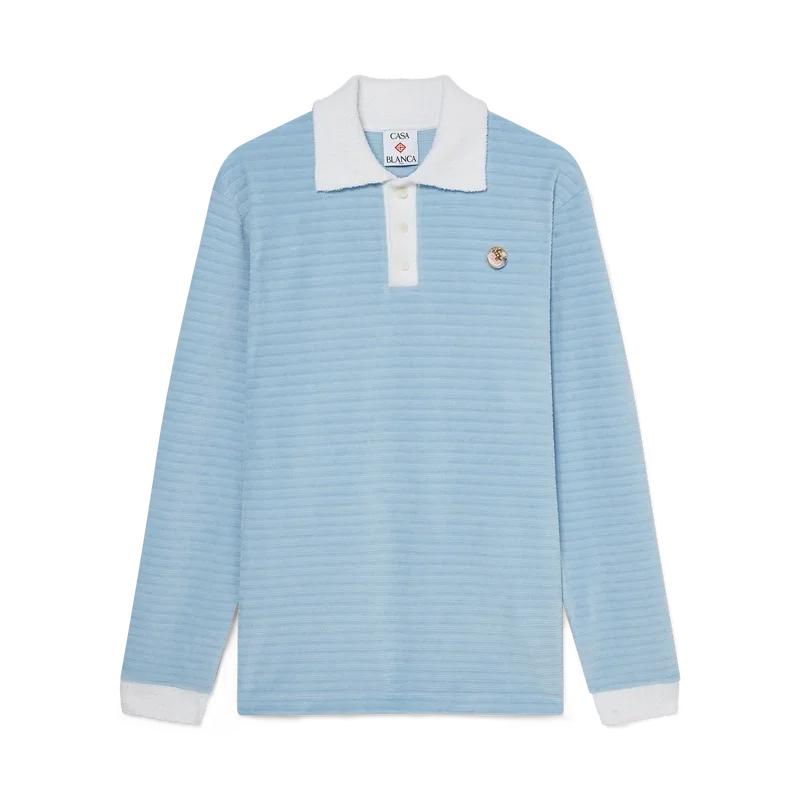 A camisa polo com riscas de veludo é um modelo de manga comprida confeccionado em tecido de veludo às riscas, com o alfinete dos Quatro Elementos da marca. Completada com botões de corozo com o logótipo Cc entrelaçado, uma carcela de três botões e uma carcela, punhos e gola em canelado contrastante.