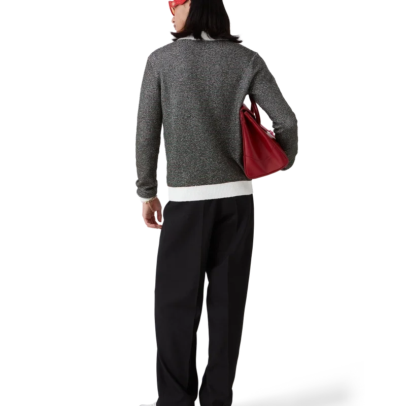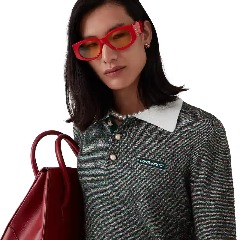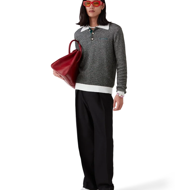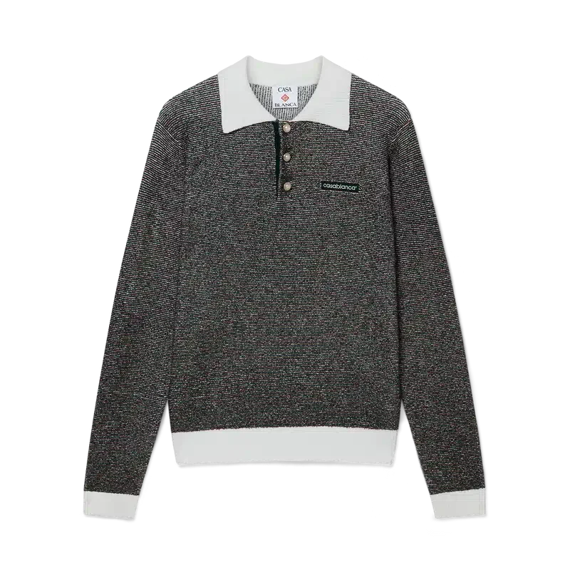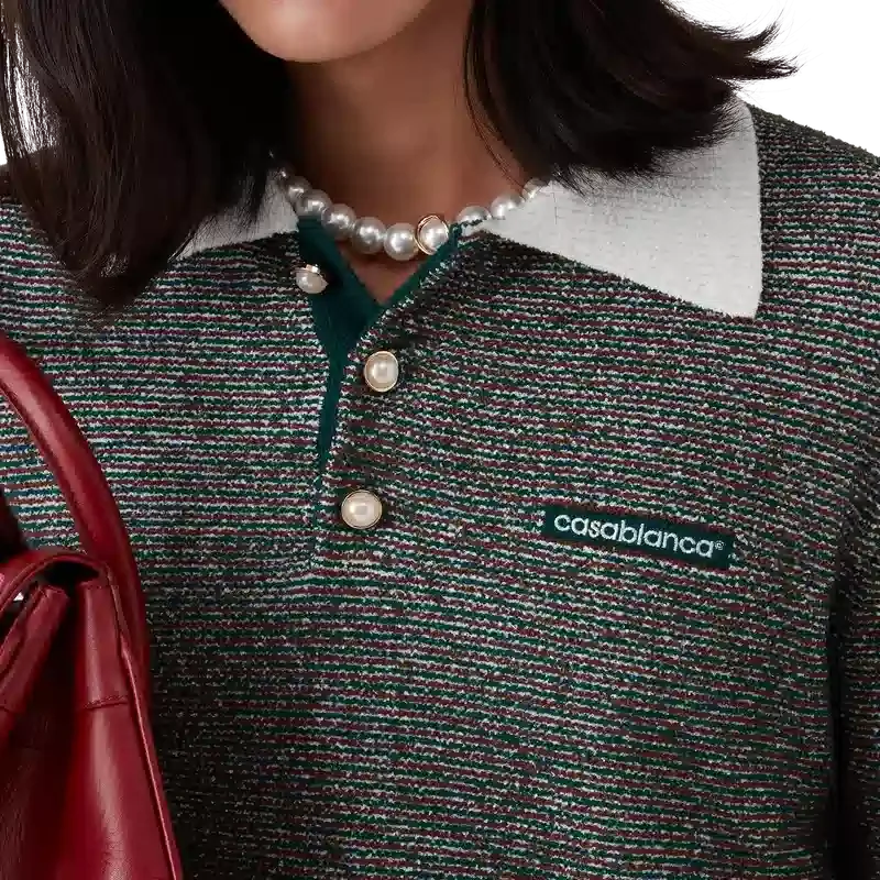 A camisa polo com riscas bouclé é um modelo de manga comprida confeccionado em tecido com riscas bouclé, apresentando o logótipo Casablanca da marca. Completa-se com uma carcela de três botões, botões de pérola com aro dourado característicos e carcela, bainha, punhos e gola em canelado contrastante.