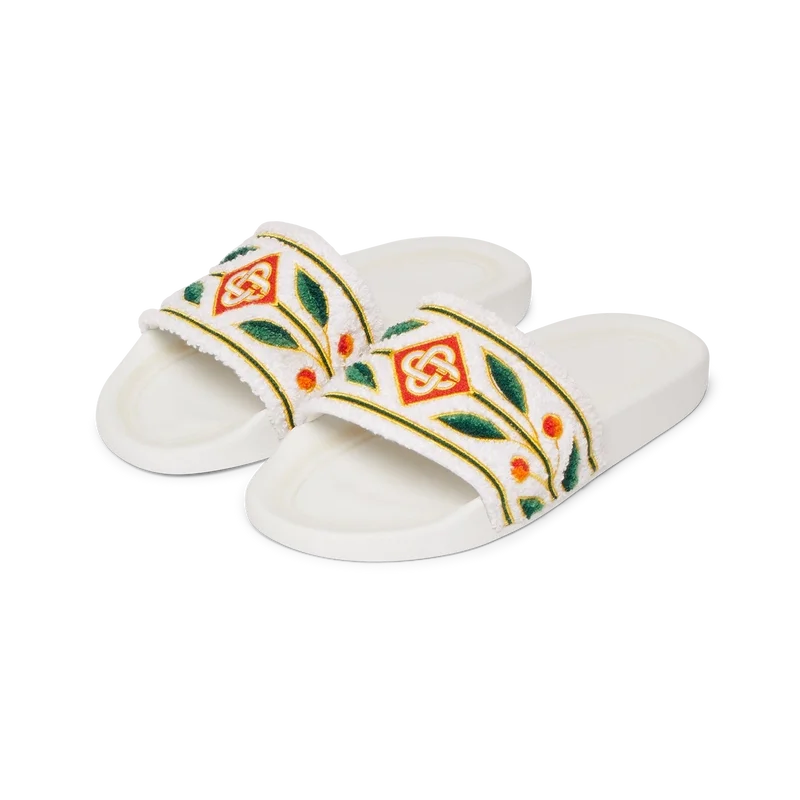Os chinelos de felpa bordados para homem são confecionados em tecido de felpa e apresentam o logótipo em forma de diamante da marca e o desenho emblemático da coroa de louros na parte superior. Completam-se com uma palmilha moldada para um conforto superior e uma sola em borracha texturada que combina desempenho com lazer.
